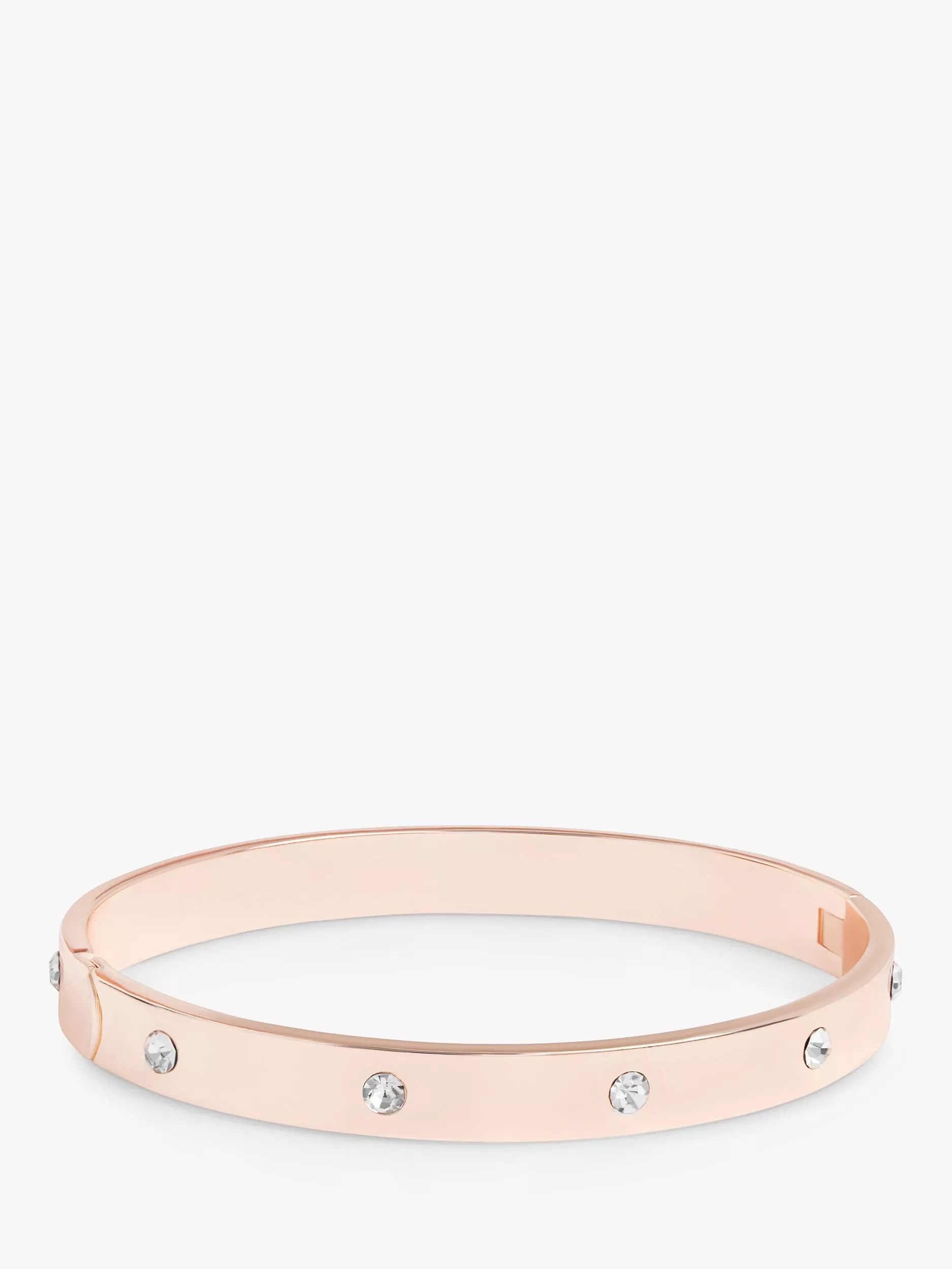 A rose gold-plated bangle from the Jon Richard range. Embellished with crystal stones, it's an ideal gift for yourself or a loved one. The hinge fastening ensures a secure fit.