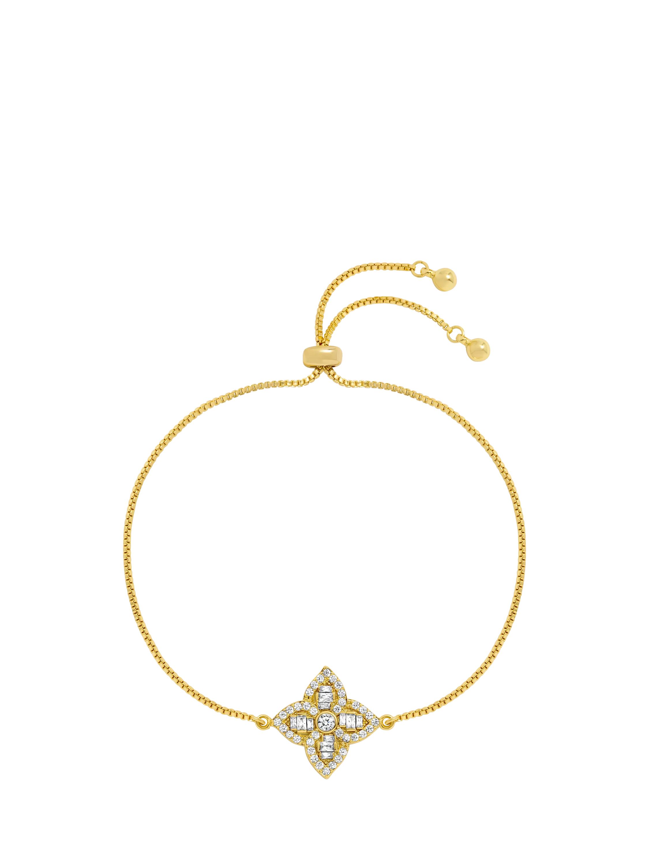 The 18ct Gold Plated and Crystal Clover Bracelet is crafted with care, this delicate piece features a timeless clover design, symbolizing luck, and love. With sparkling crystals and finished in radiant 18k gold plating. It’s the perfect addition to any Jewellery collection. Secured with a toggle fastening.