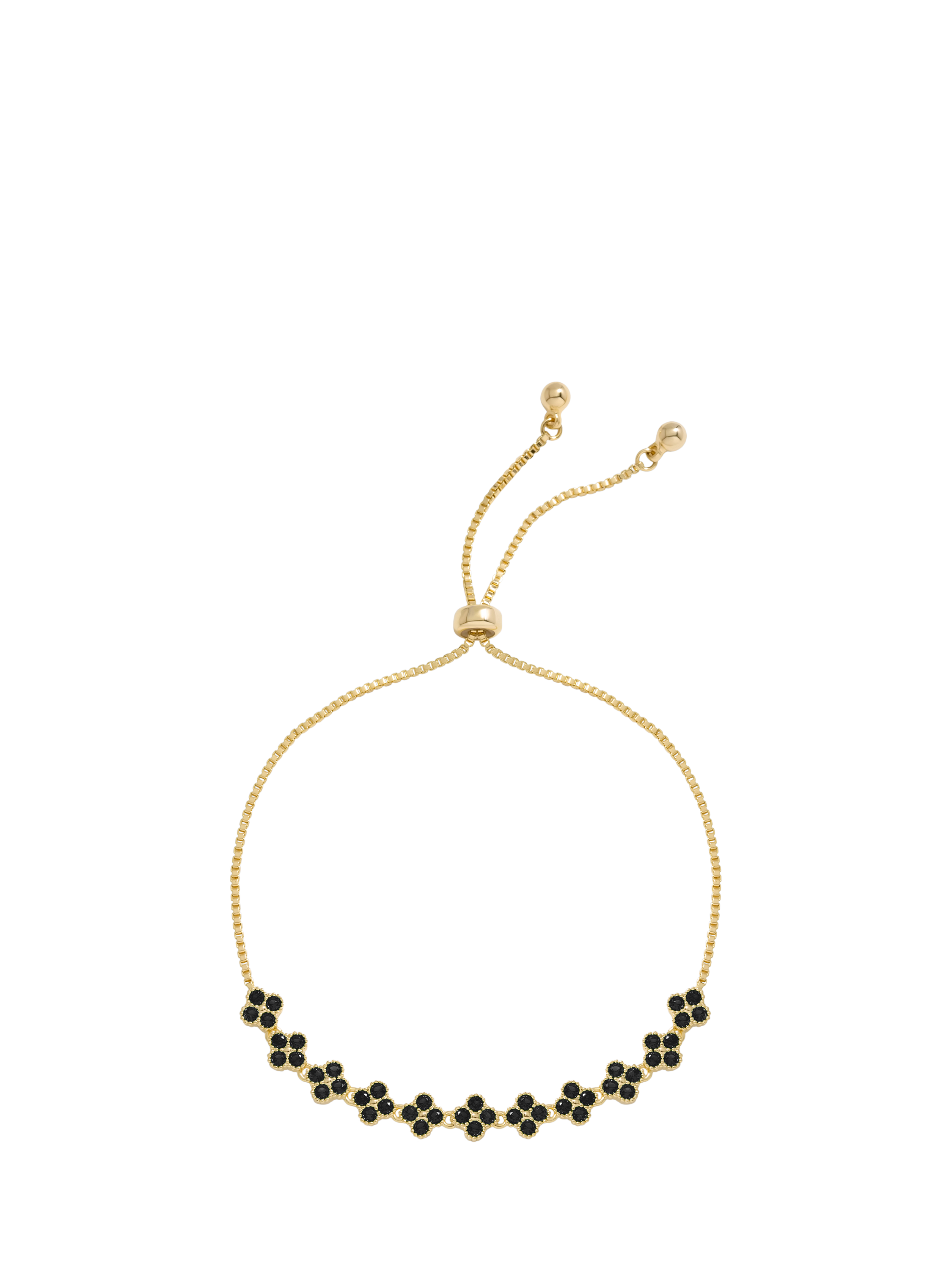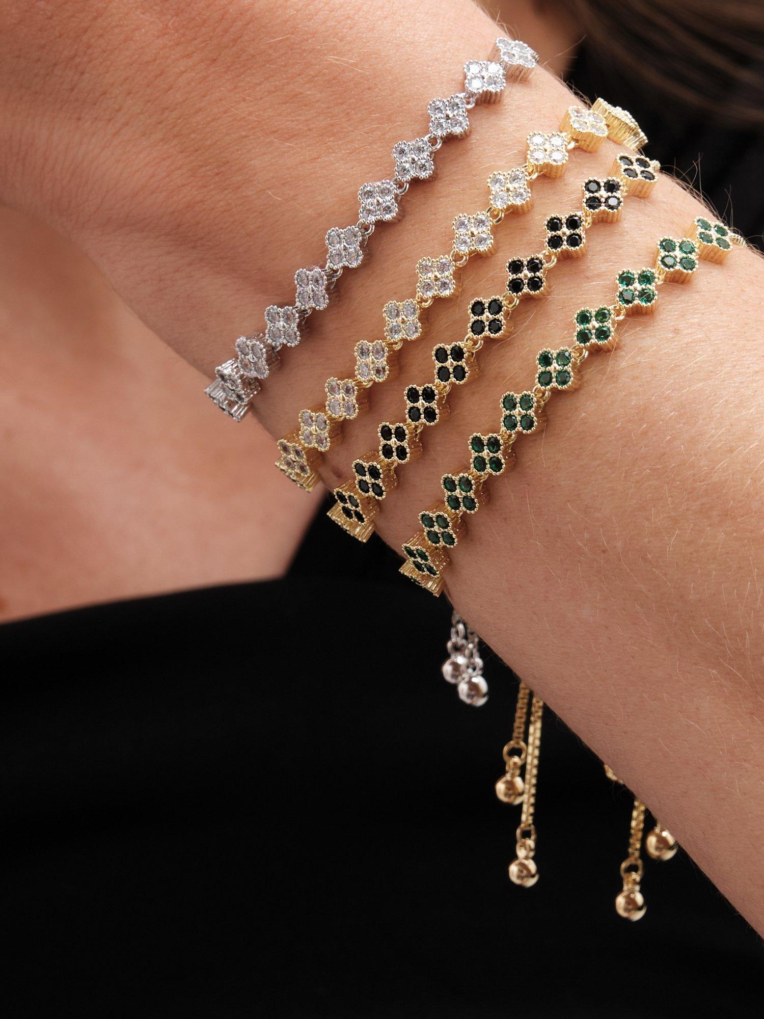 This chain bracelet features a row of clover-shaped charms set with crystal gemstones. The toggle fastening allows it to be adjusted to fit any sized wrist.