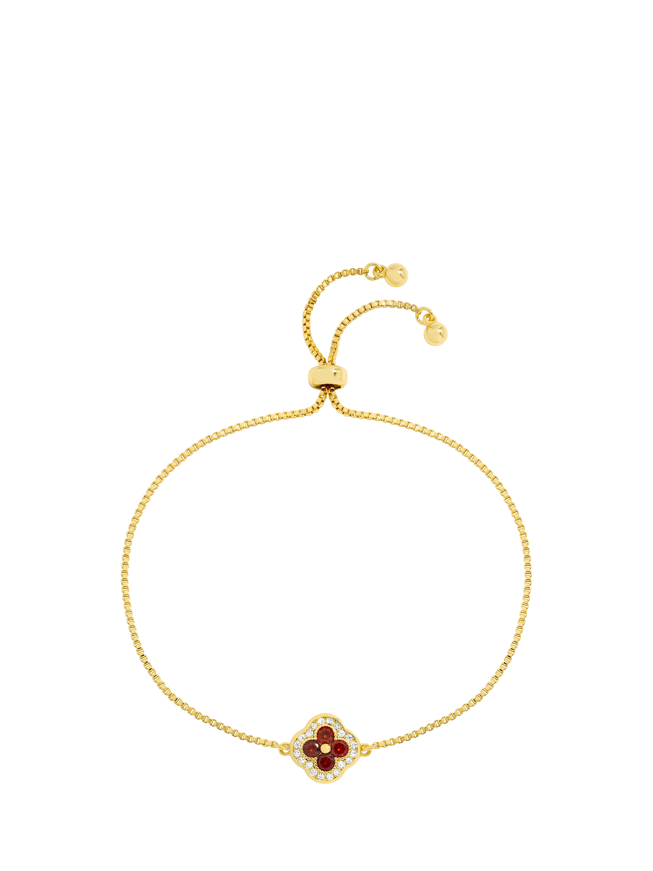 The 14ct Gold Plated Clover Toggle Bracelet is delicately designed, featuring a delicate clover design that symbolises luck and love. Set with rich-toned ruby or sapphire stones and finished in radiant silver or gold plating, this timeless piece adds a touch of elegance to any jewellery collection. Secured with a toggle fastening.