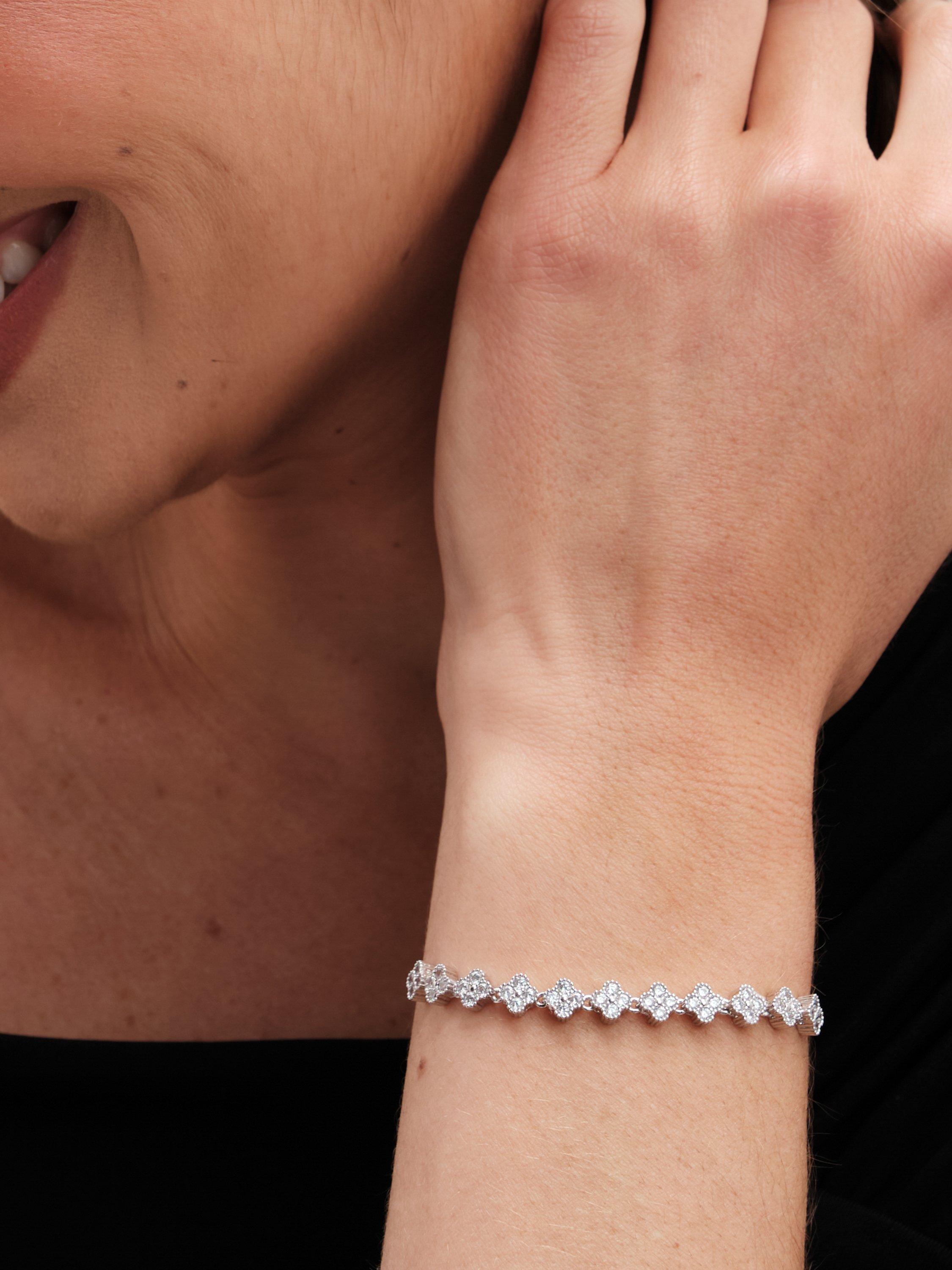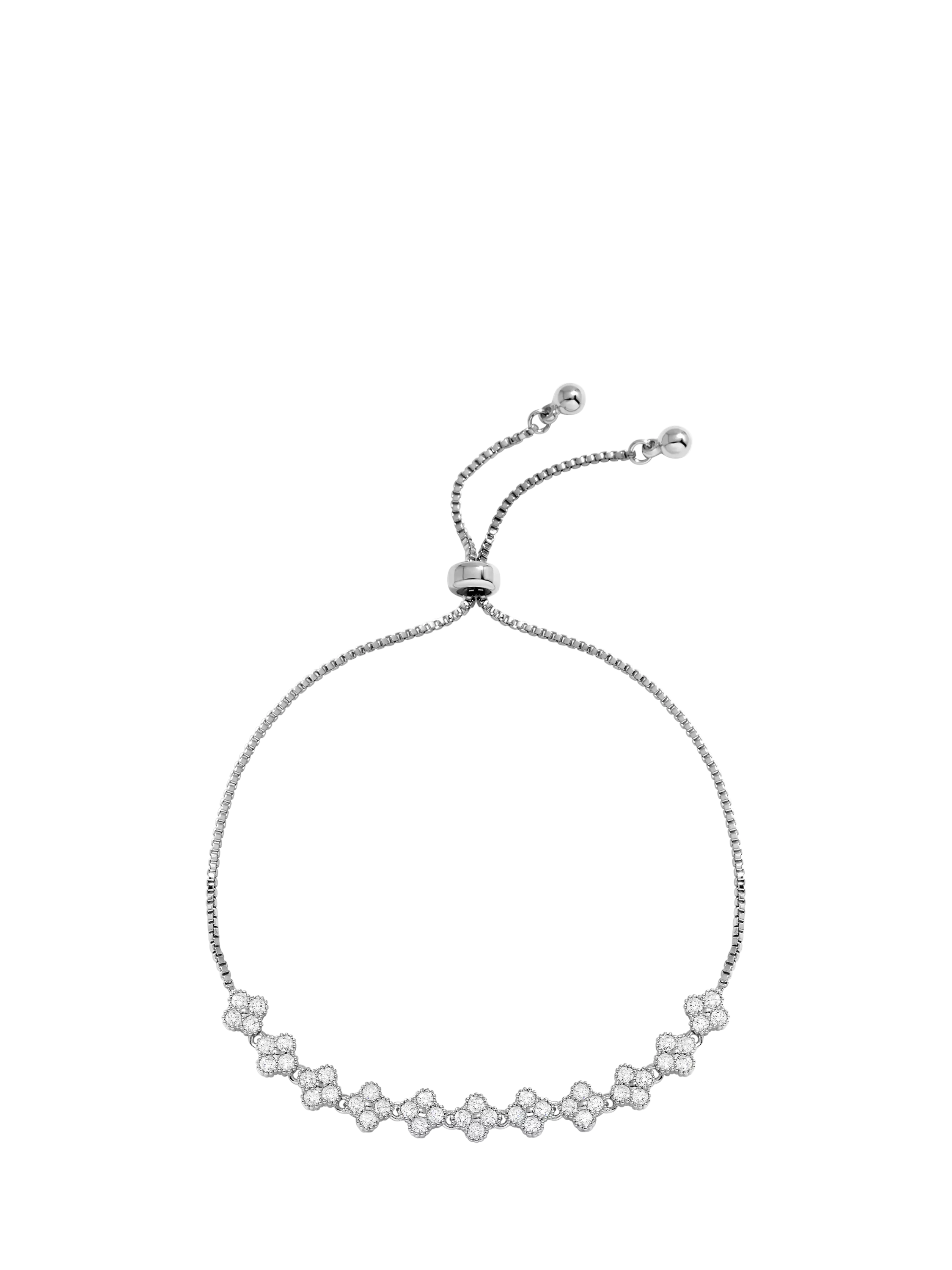 This chain bracelet features a row of clover-shaped charms set with crystal gemstones. The toggle fastening allows it to be adjusted to fit any sized wrist.