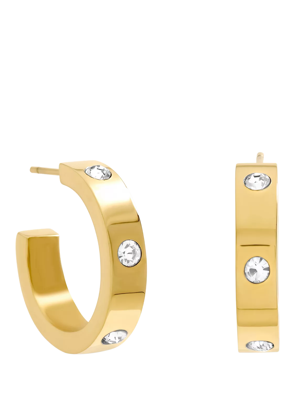 These crystal hoops integrate subtle sparkle into a classic design. The foundation is waterproof stainless steel, ensuring the clarity of the crystals and the longevity of the gold finish. Suitable for pierced ears only.