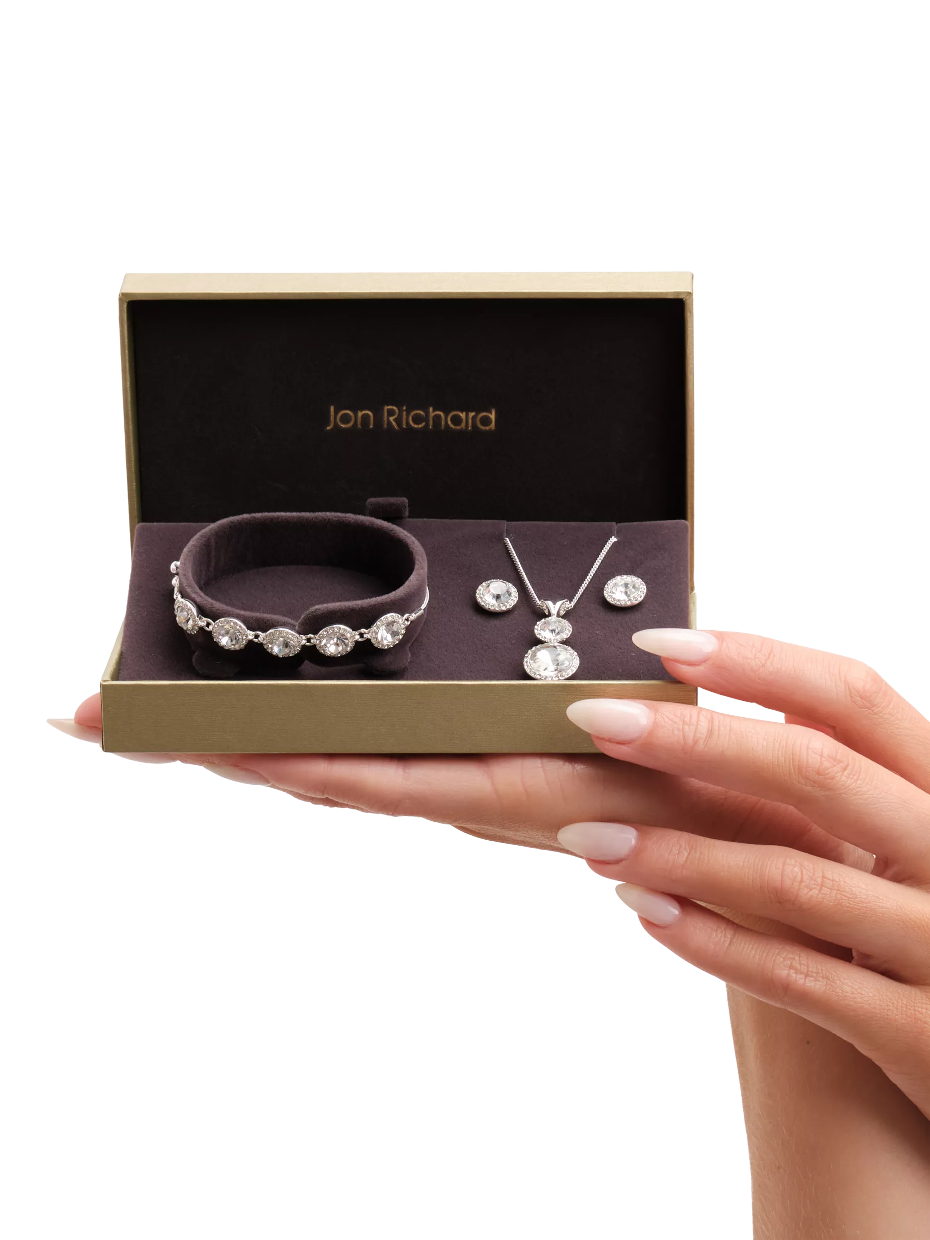 A beautifully boxed three piece jewellery set from Jon Richard. Featuring a pair of crystal cubic zirconia halo solitaire earrings, a matching necklace and bracelet, this set can be worn together or separately with other pieces. Presented in a lovely gift box, this set is the perfect gift for yourself or a loved one. The earrings are suitable for pierced ears only.