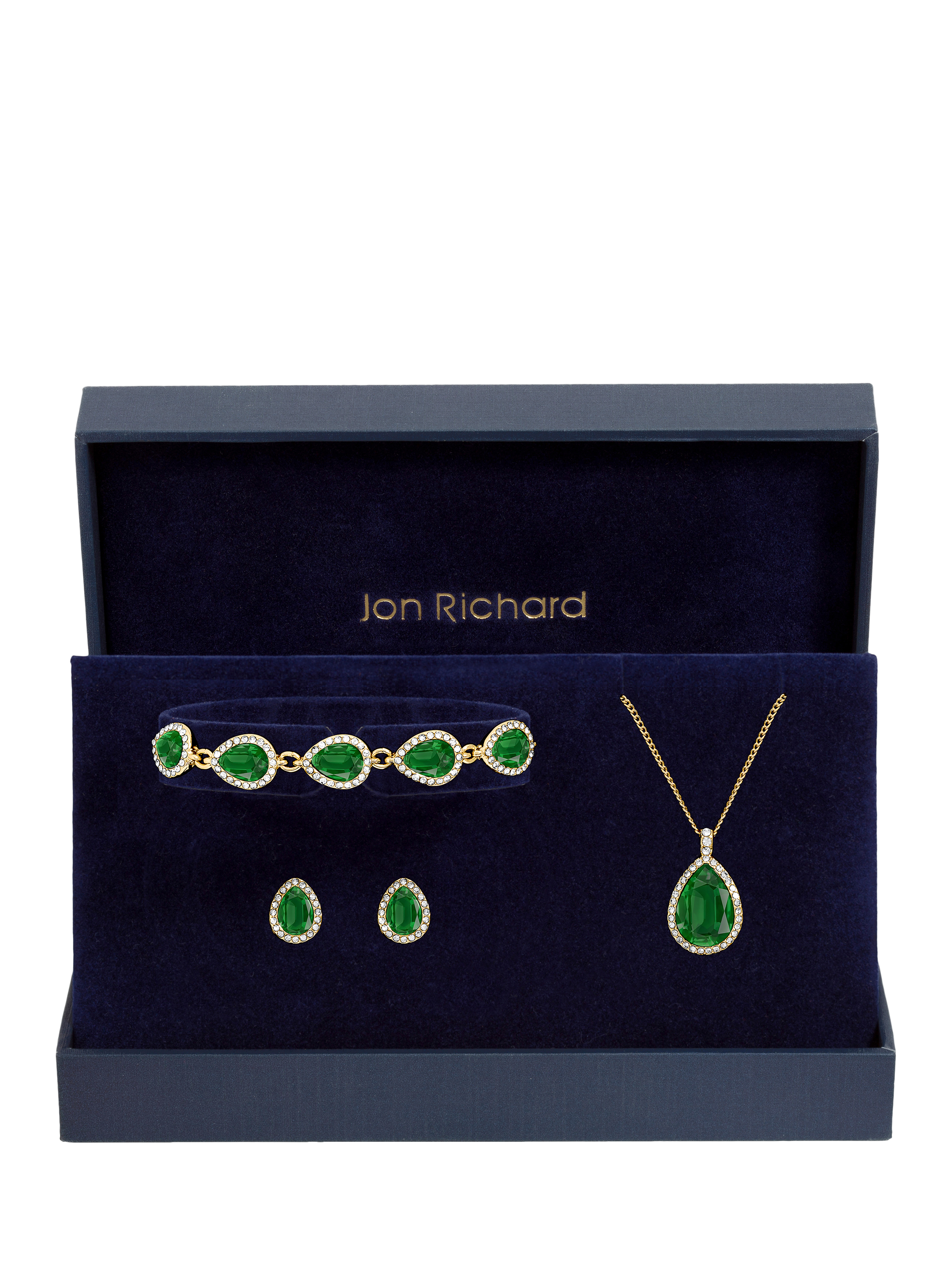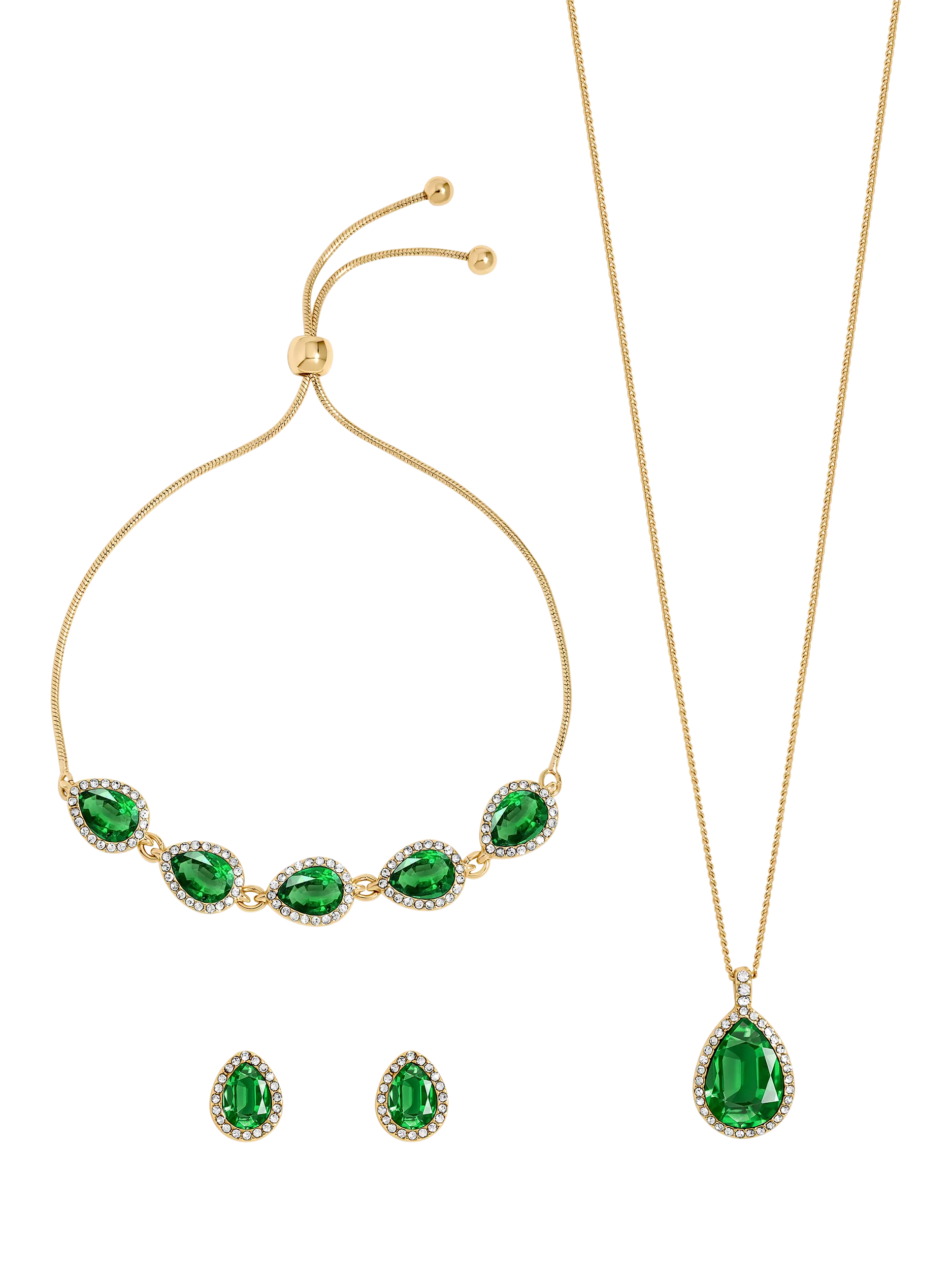 The Gold Plated and Emerald Pear Drop Trio Set is designed to add bold elegance to any occasion. Featuring bold emerald stones set against a rich gold plated finish, this stunning set is the perfect way to elevate your jewellery collection with statement style. The earrings are suitable for pierced ears only.