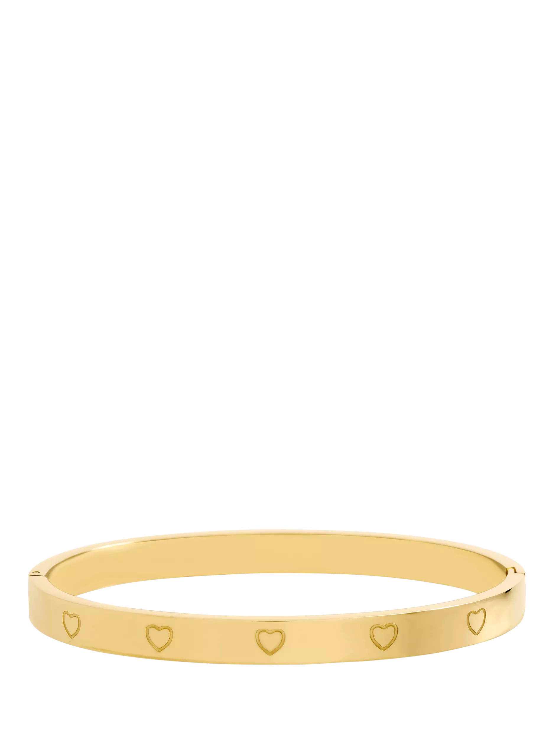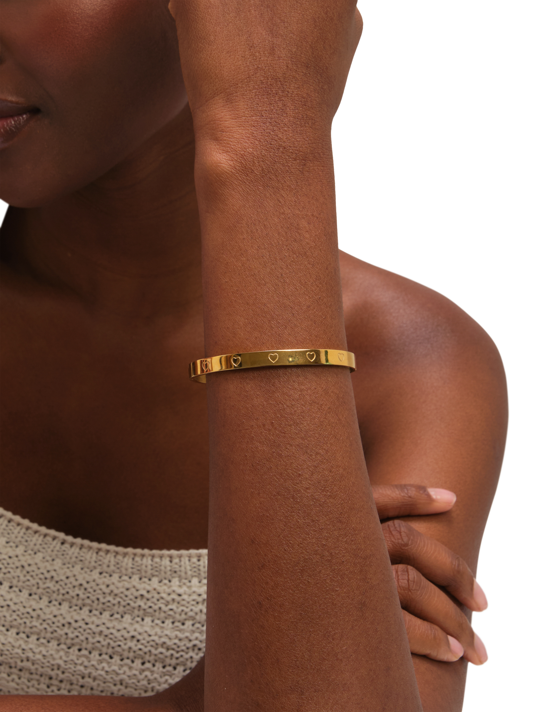 This clean-lined heart bangle provides a sleek, modern curve for effortless stacking. The plating is supported by waterproof stainless steel, guaranteeing superior durability and non-stop wearability.