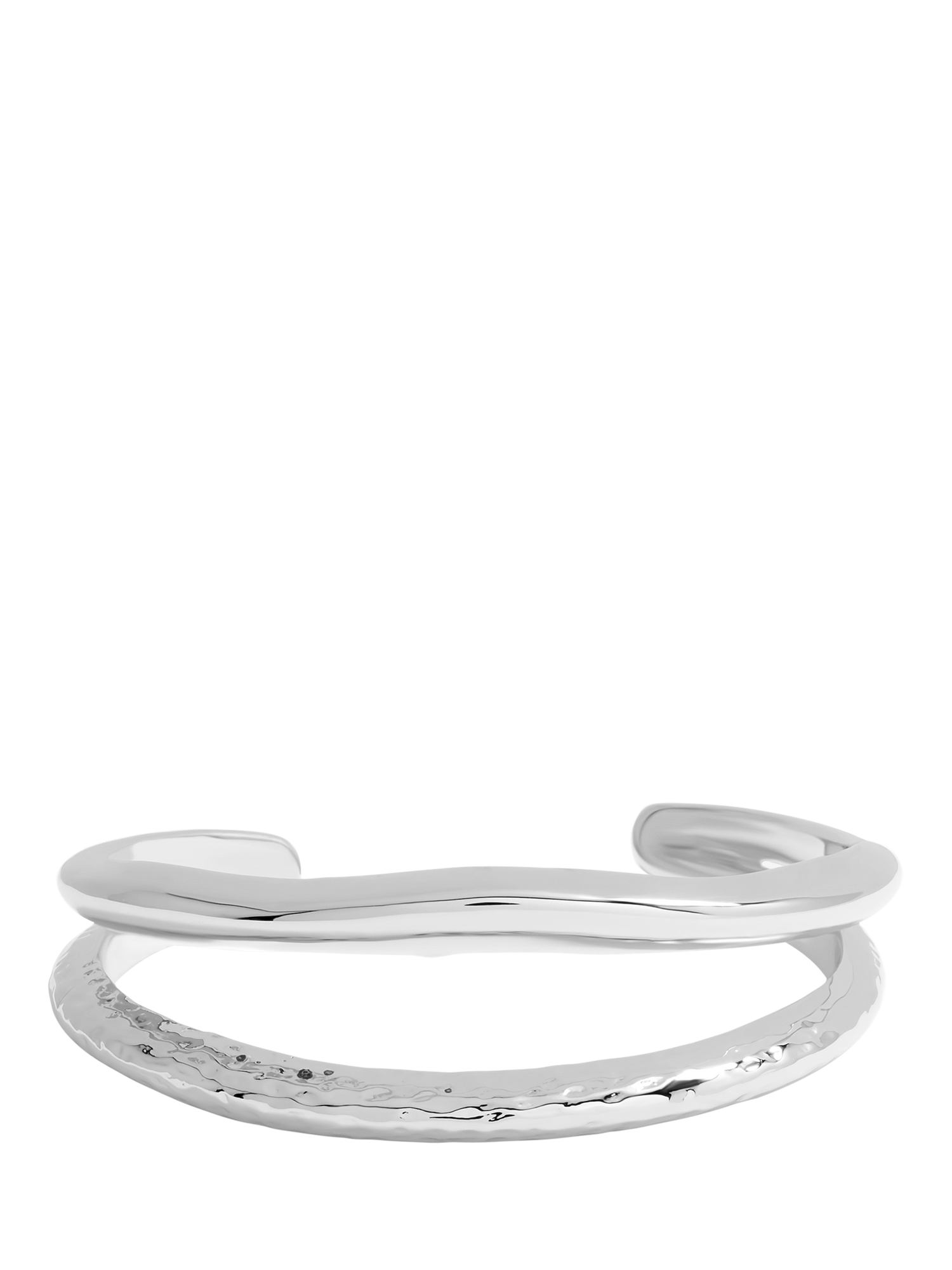 This elegant cuff has an open, double-layered design, with both a hammered and polished finish adding texture and depth. It's comfortable and easy-to-wear with both casual or more formal outfits.
