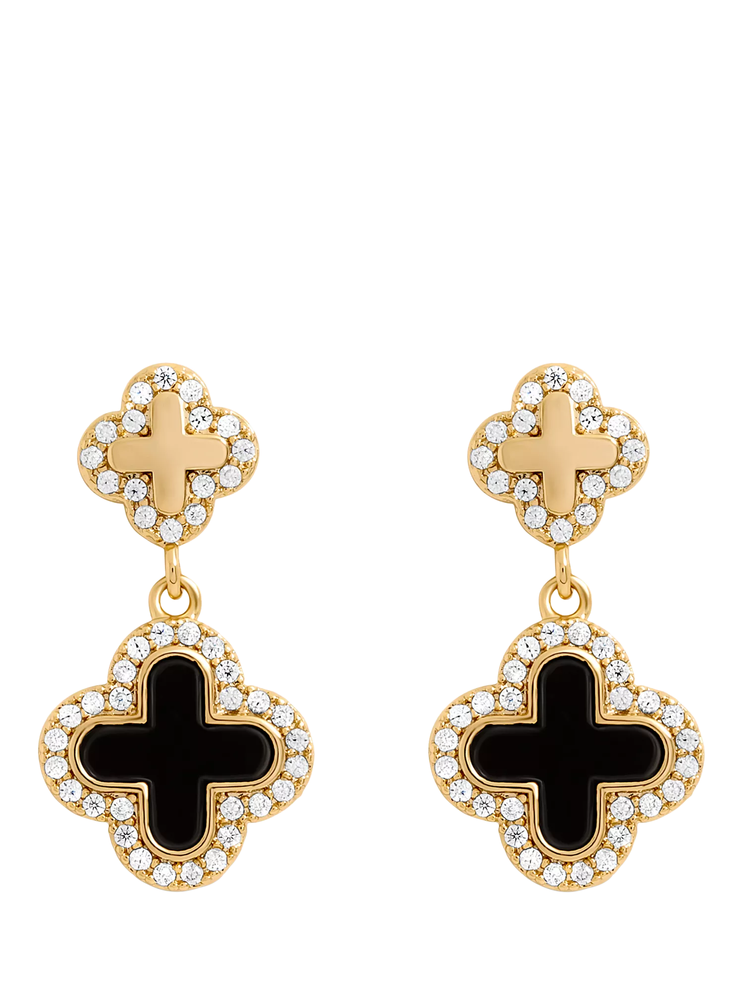 The Gold Plated Pave and Jet Enamel Clover Earring is a classic style, these delicate earrings feature a timeless clover design, symbolizing luck, and love. With a hint of deep jet and sparkling pave crystals, finished in radiant gold plating. It’s the perfect addition to any Jewellery collection. Fastened with a post and bullet back, they are suitable for pierced ears only.