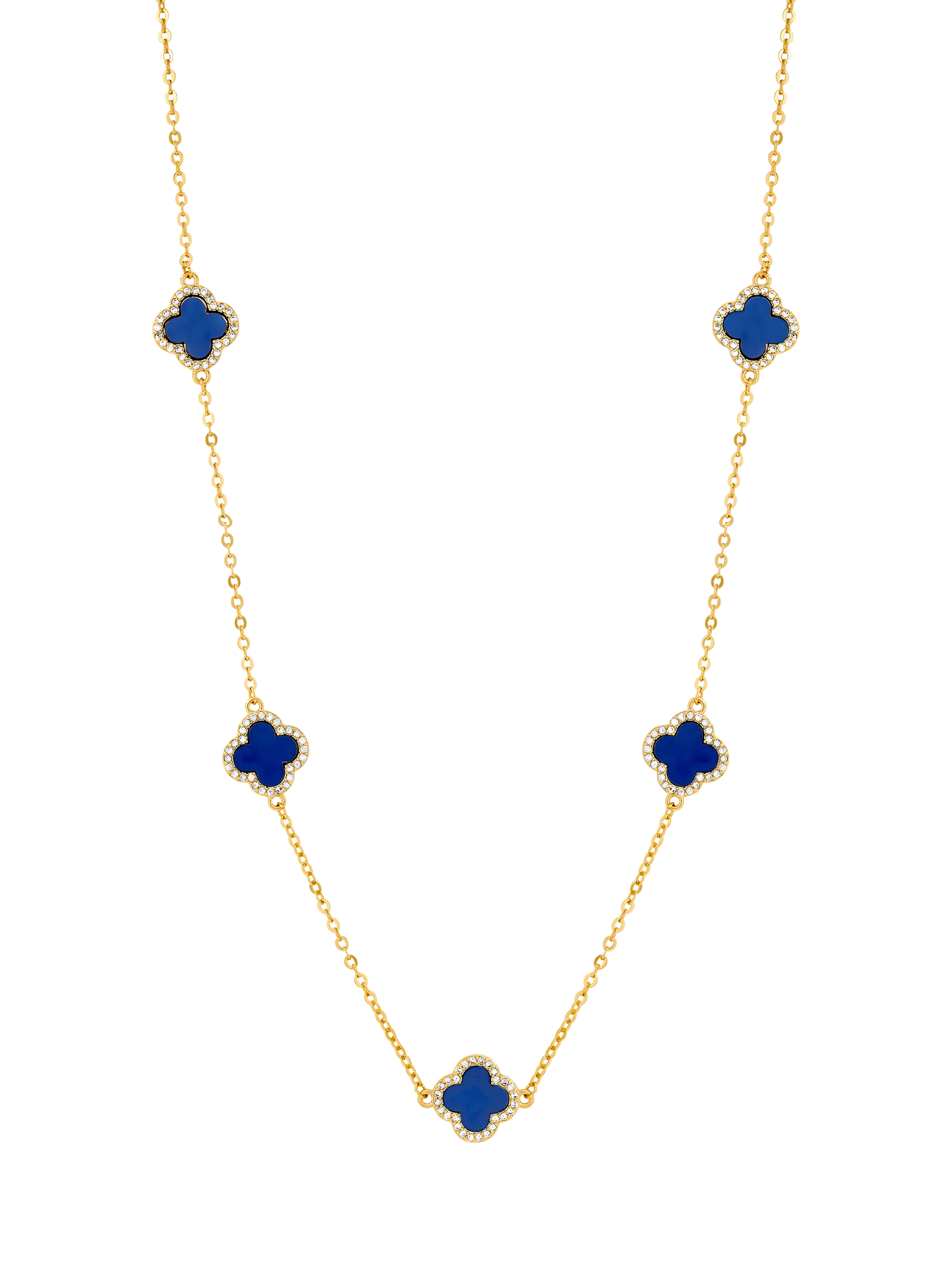 The Gold Plated Lapis Station Clover Necklace is expertly finished and designed with meaning. Featuring deep lapis stone that catches the light from every angle and finished in shiny gold plating, this graceful design adds a touch of luck and timeless shine.