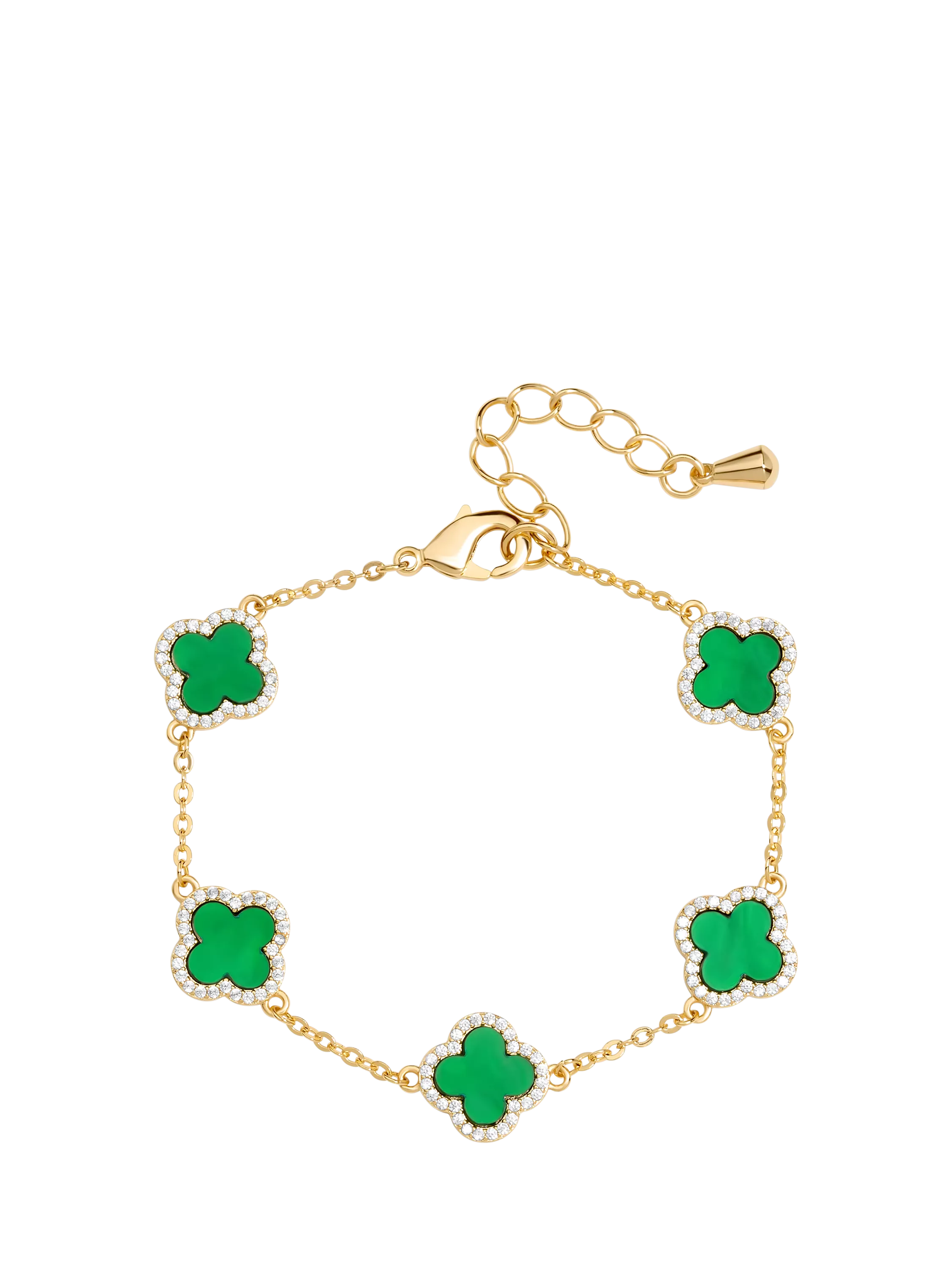 The Jon Richard Gold Plated Cubic Zirconia Malachite Clover Bracelet is a sophisticated and classic piece that adds a touch of elegance to any outfit. Featuring a series of clover-shaped links, this bracelet is perfect for any occasion to finish all outfits.