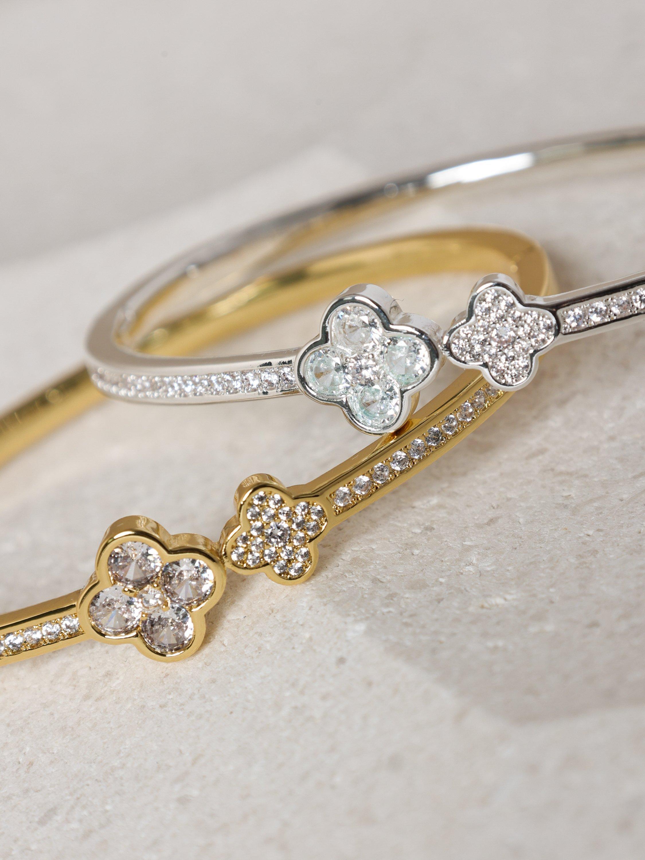 The Rhodium Plated and Pave Clover Bangle is expertly finished, designed to bring a touch of luck to your everyday style. Featuring striking pave crystals made to sparkle and finished in rich rhodium plating, this statement piece adds a touch of timeless sophistication. It’s the perfect addition to any jewellery collection.