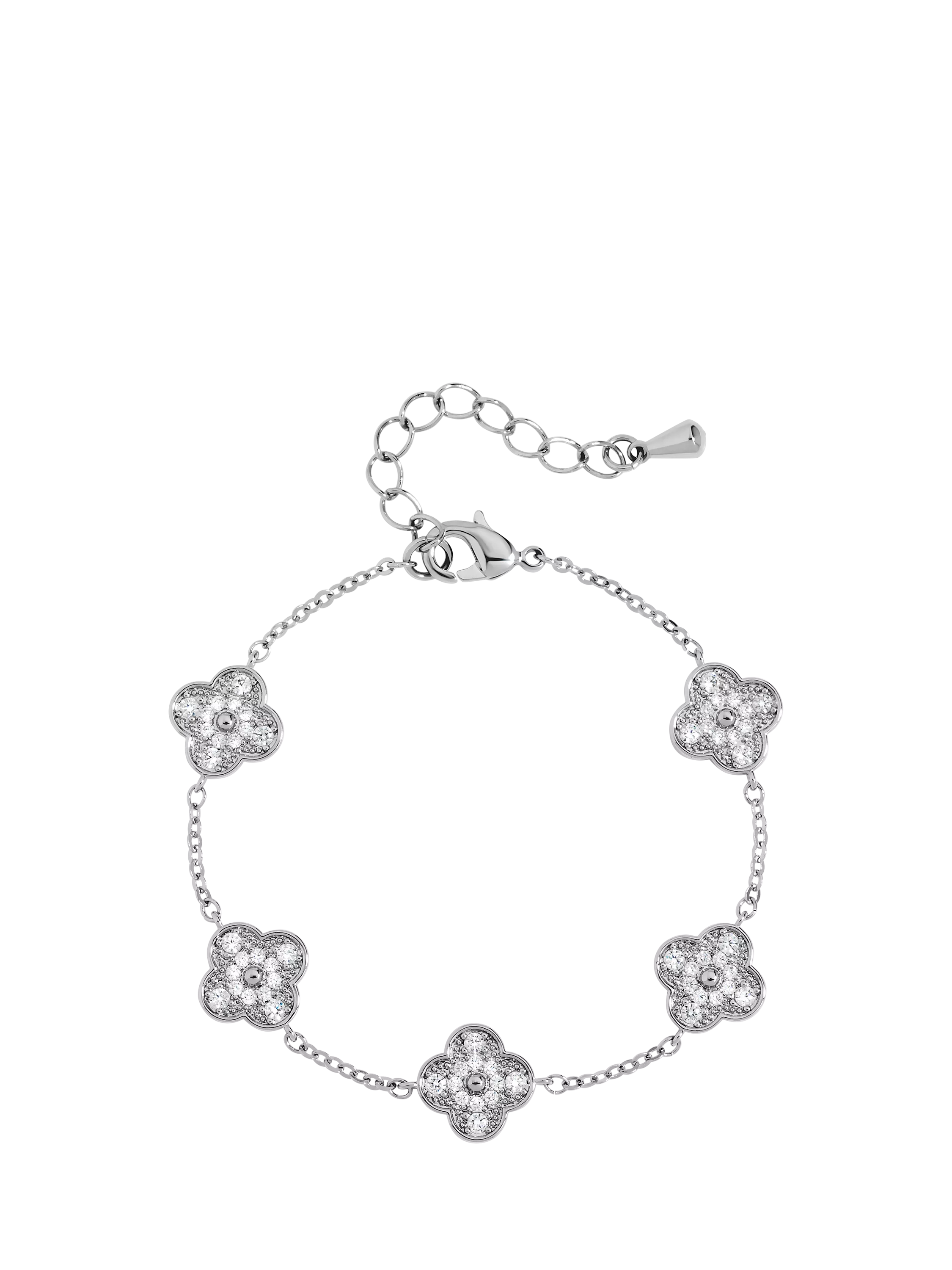 The Rhodium Plated and Pave Clover Bracelet is expertly finished and designed with meaning. Featuring Pave crystals that catch the light from every angle and finished in shiny rhodium plating, this graceful design adds a touch of luck and timeless shine. It is the perfect piece to elevate your jewellery collection.