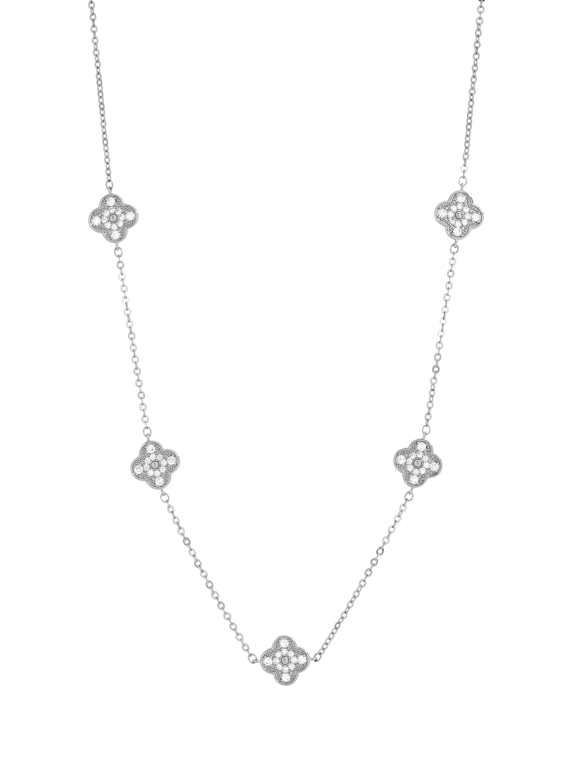 The Rhodium Plated and Pave Clover Necklace is crafted with care, this delicate piece features a timeless clover design, symbolizing luck, and love. With sparkling pave crystals, finished in radiant rhodium plating. It is the perfect addition to any Jewellery collection.