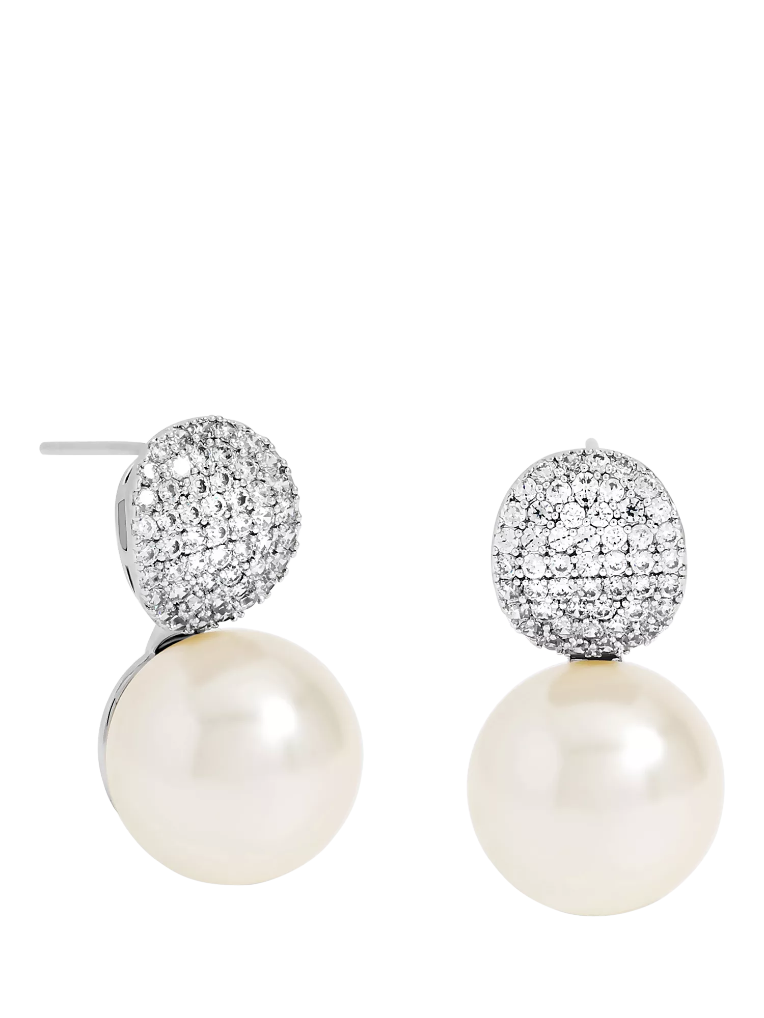 The Rhodium Plated Pave and Pearl Drop Earrings are expertly finished, designed to bring bold elegance to your everyday style. Featuring striking pave Crystals and shiny pearls, made to sparkle and finished in rich rhodium plating, these drops add a touch of timeless sophistication. It is the perfect addition to any jewellery collection. Suitable for pierced ears only.