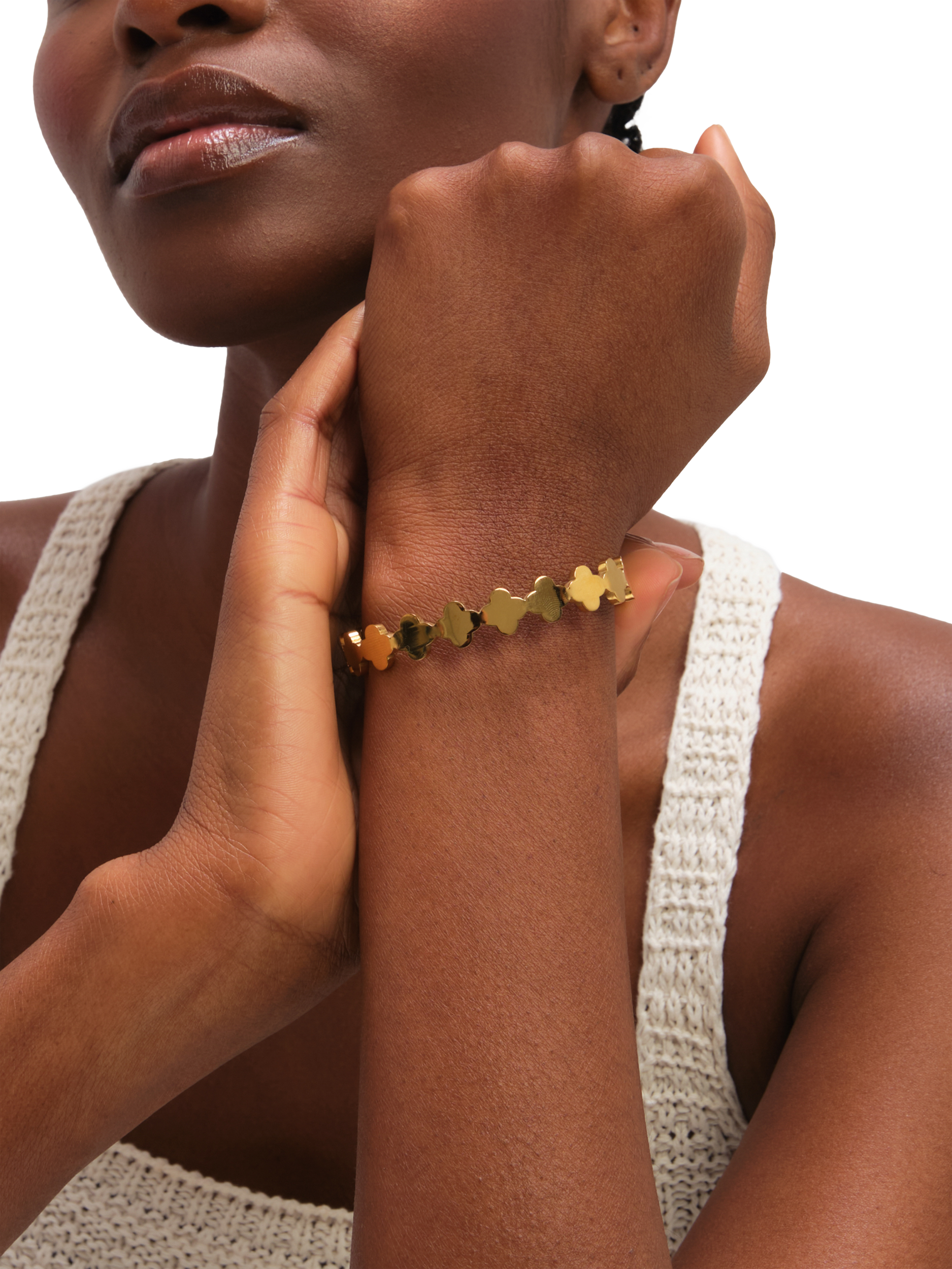 A polished clover detail elevates this bangle, making it a modern, lucky accent. Its waterproof stainless steel build is designed for maximum resilience, maintaining a perfect shine through every routine.