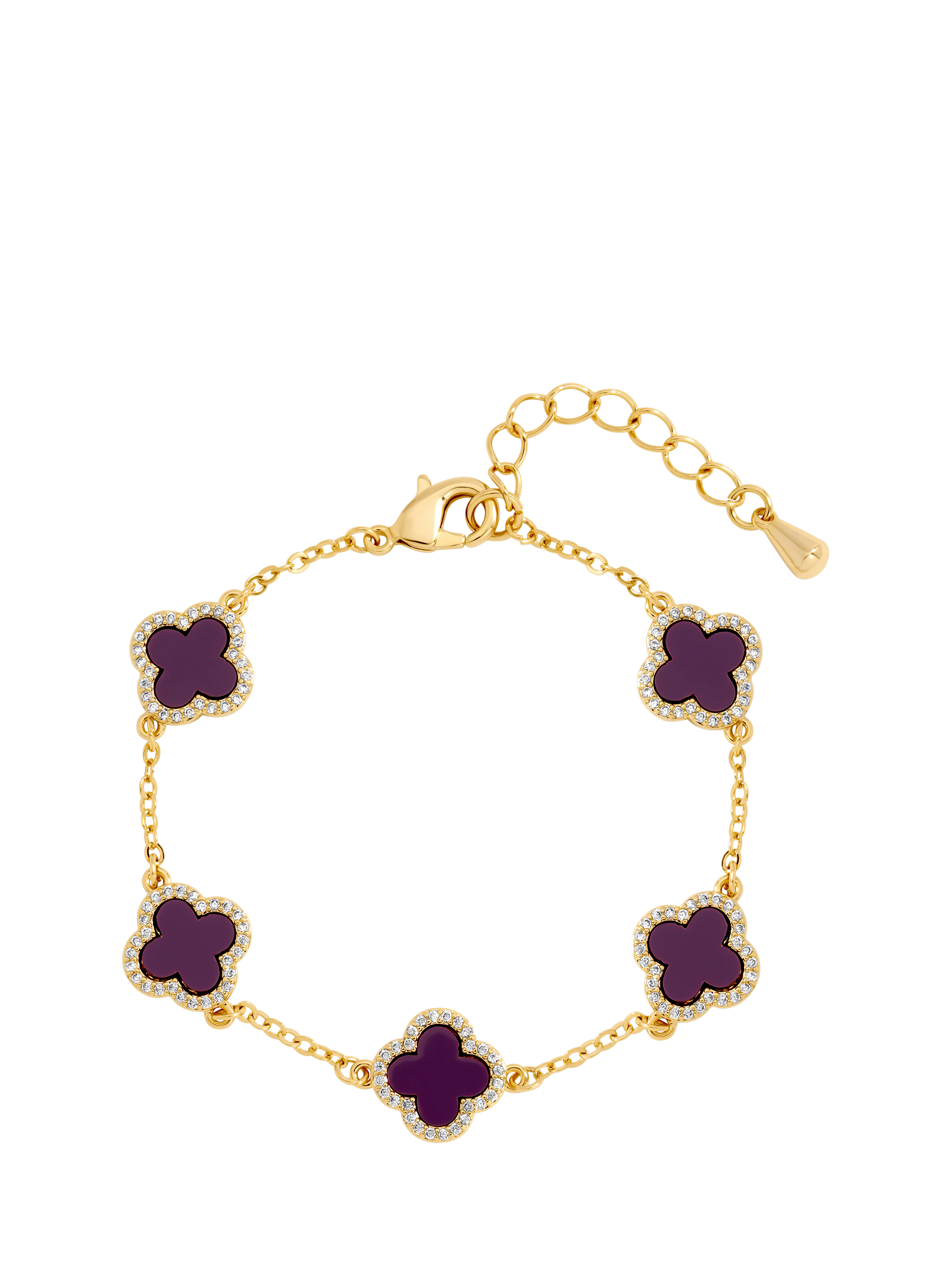 The Jon Richard Gold Plated Purple Clover Station Bracelet is a sophisticated and stylish addition to any jewellery collection. Featuring polished gold plated clover motifs in a rich purple hue, spaced along a delicate chain, it catches the light beautifully from every angle. Perfect for both day and evening wear, this bracelet adds refined elegance and a playful pop of colour to the wrist.
