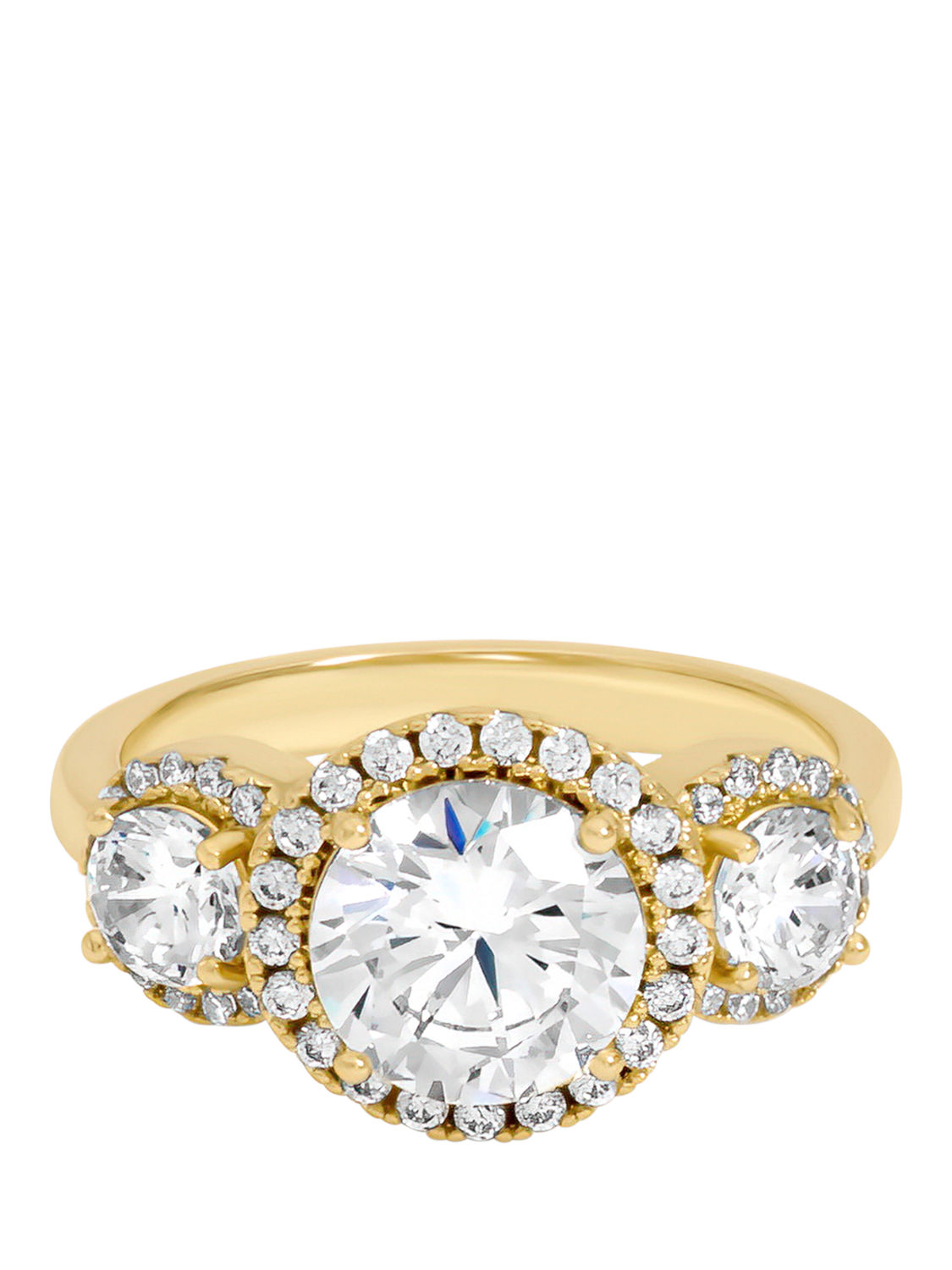 The Jon Richard Gold Plated Triple Stone Ring is a striking and sophisticated addition to any jewellery collection. Featuring three sparkling cubic zirconia set in polished gold plating, it catches the light beautifully from every angle. UK size M 1/2.
