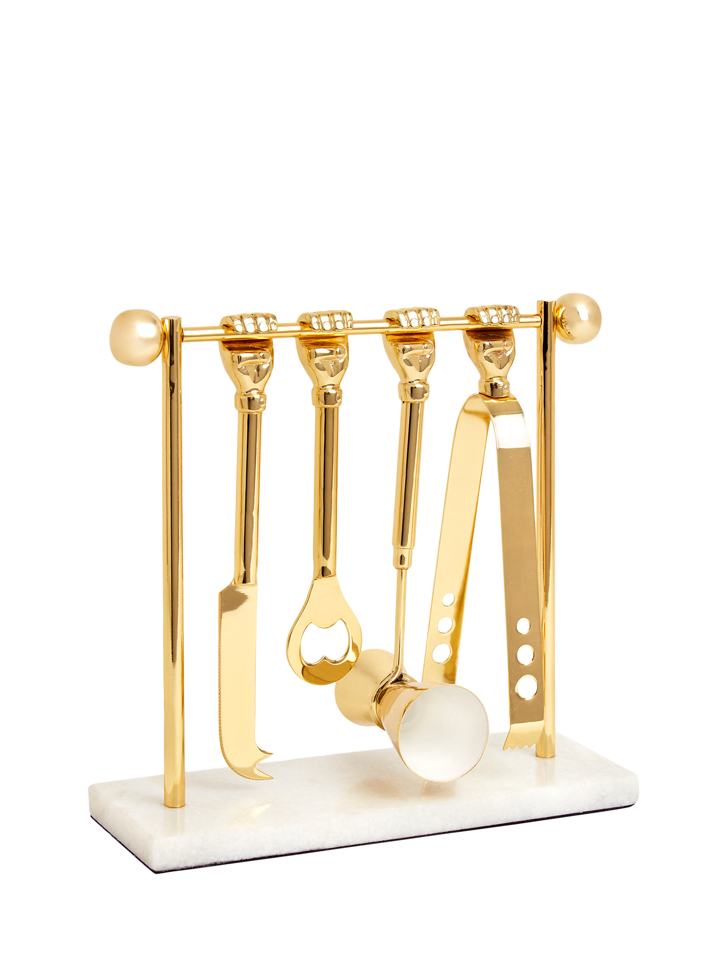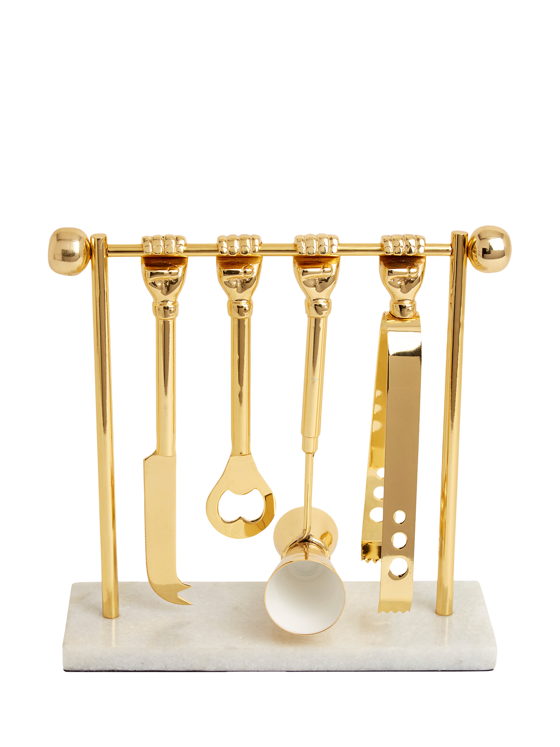 The perfect drink takes proper training. Inspired by the original workout gear: classic barbells, these brass bar tools latch onto a solid brass dumbbell elevated on a marble base. This set includes ice tongs, a bottle opener, a double jigger and a knife.