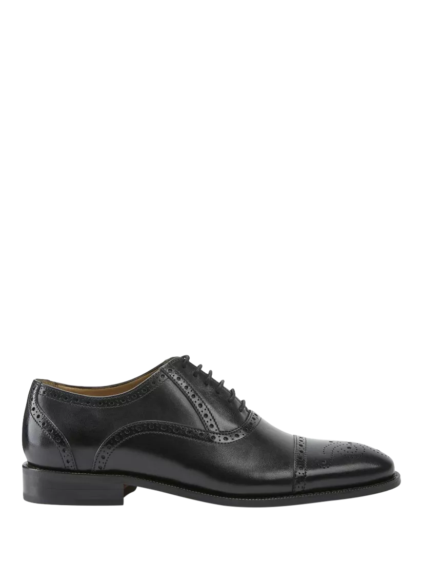 Never underestimate the impact of power dressing, a classic leather formal punctuated with brogue detailing across the Oxford silhouette. Created with smooth polished leathers with traditional toe cap and almond toe, padded sock and tongue adds comfort to your formal edits.