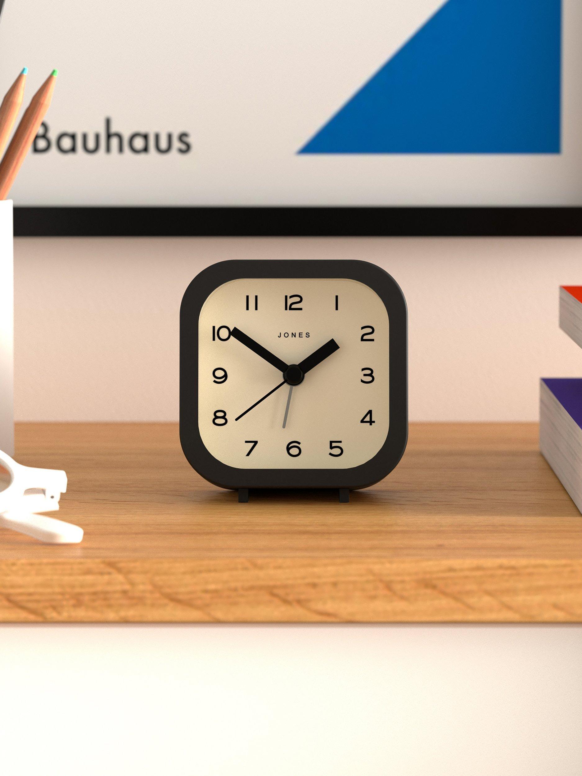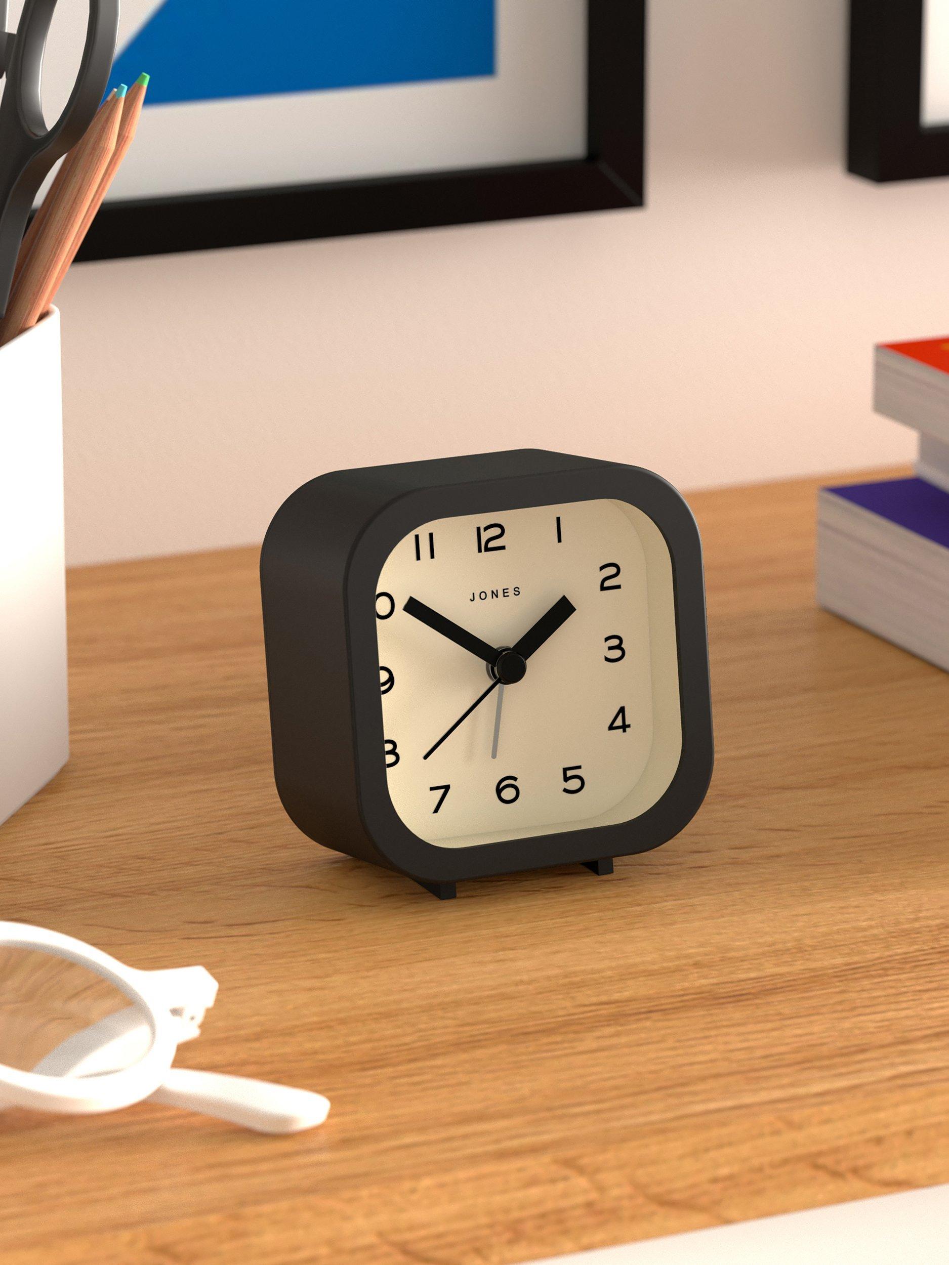 A contemporary and minimalist design, the Jones Clocks Bob analogue alarm clock has an acrylic case, chunky clock hands, gentle ticking noise and easy-to-read Arabic numerals marking the hours. This compact square design is sized to fit a bedside or office table.