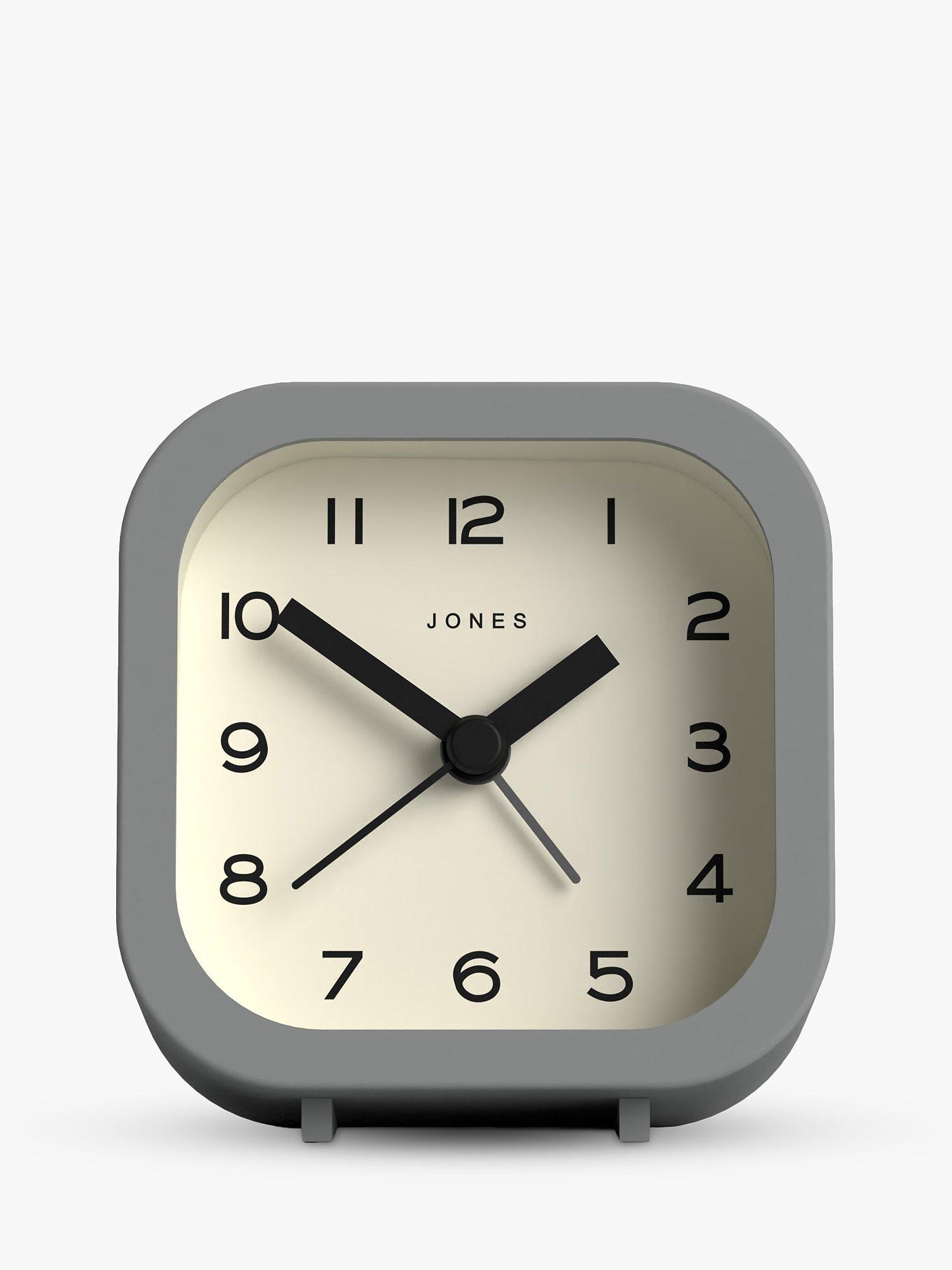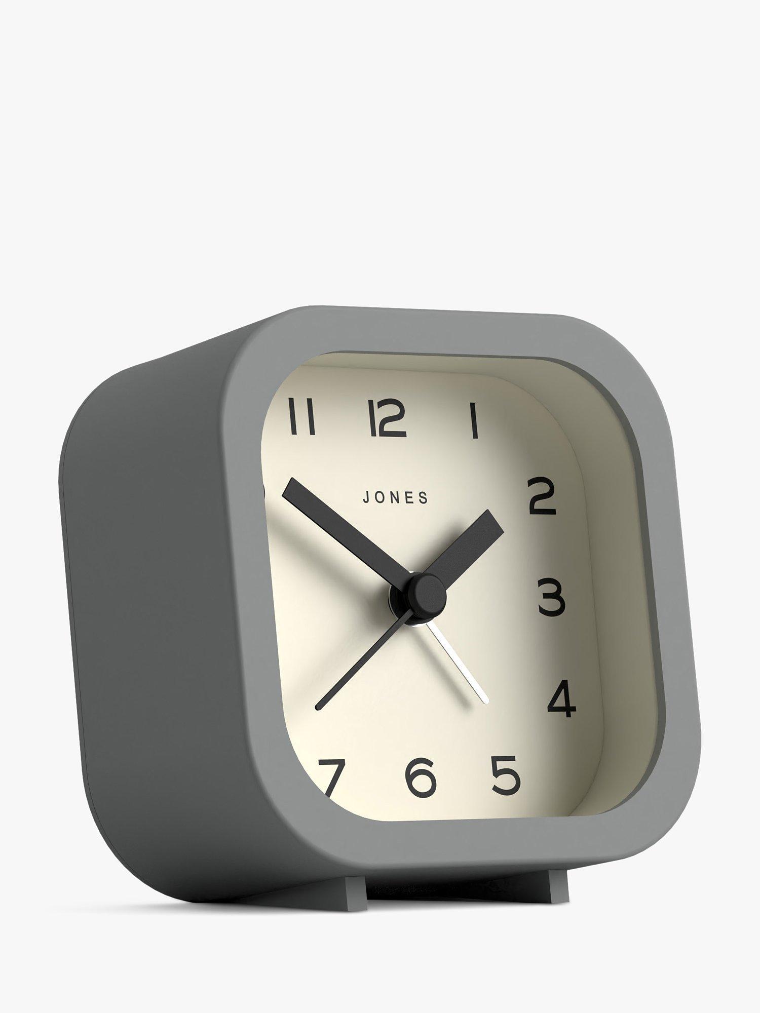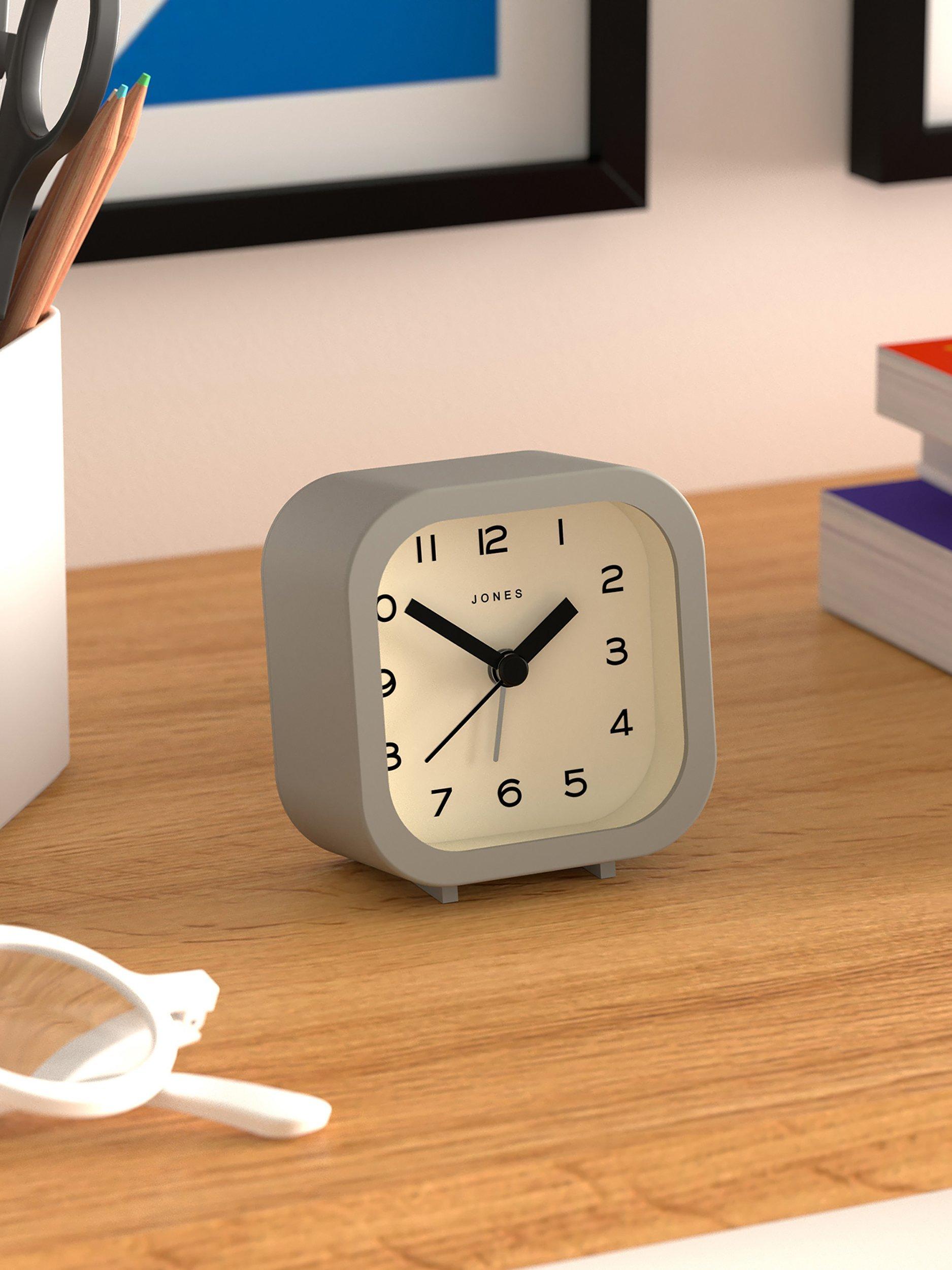A contemporary and minimalist design, the Jones Clocks Bob analogue alarm clock has an acrylic case, chunky clock hands, gentle ticking noise and easy-to-read Arabic numerals marking the hours. This compact square design is sized to fit a bedside or office table.