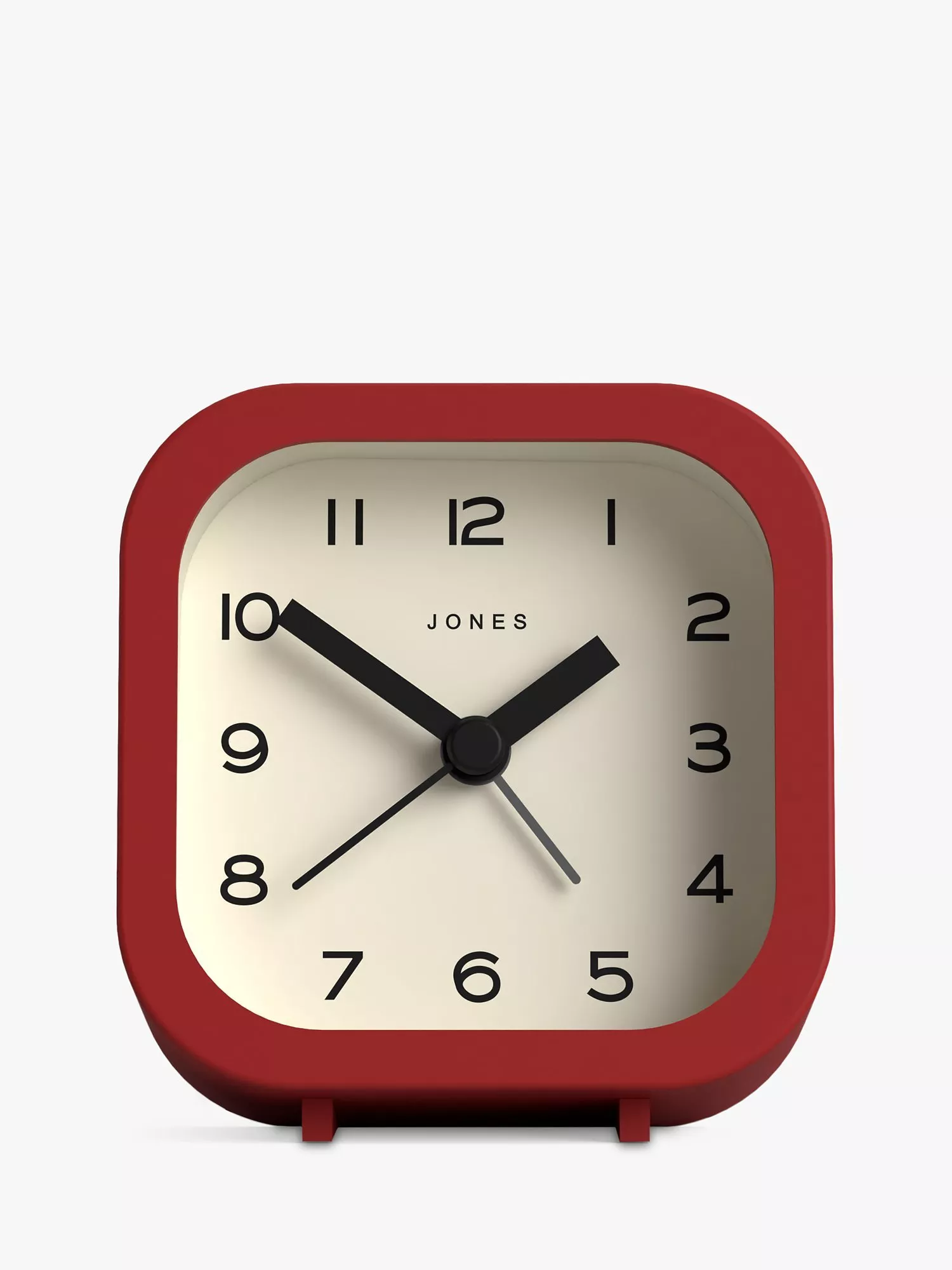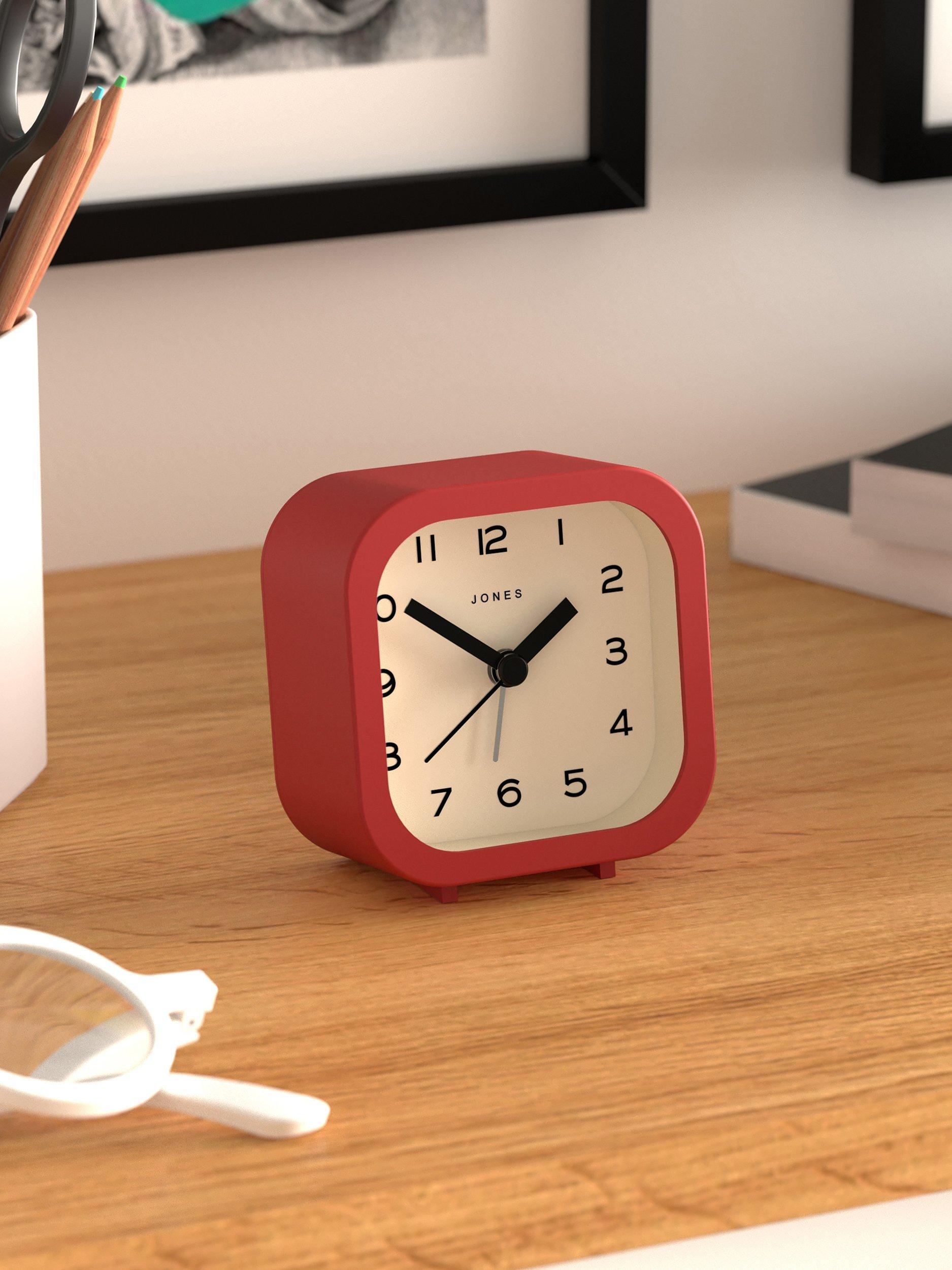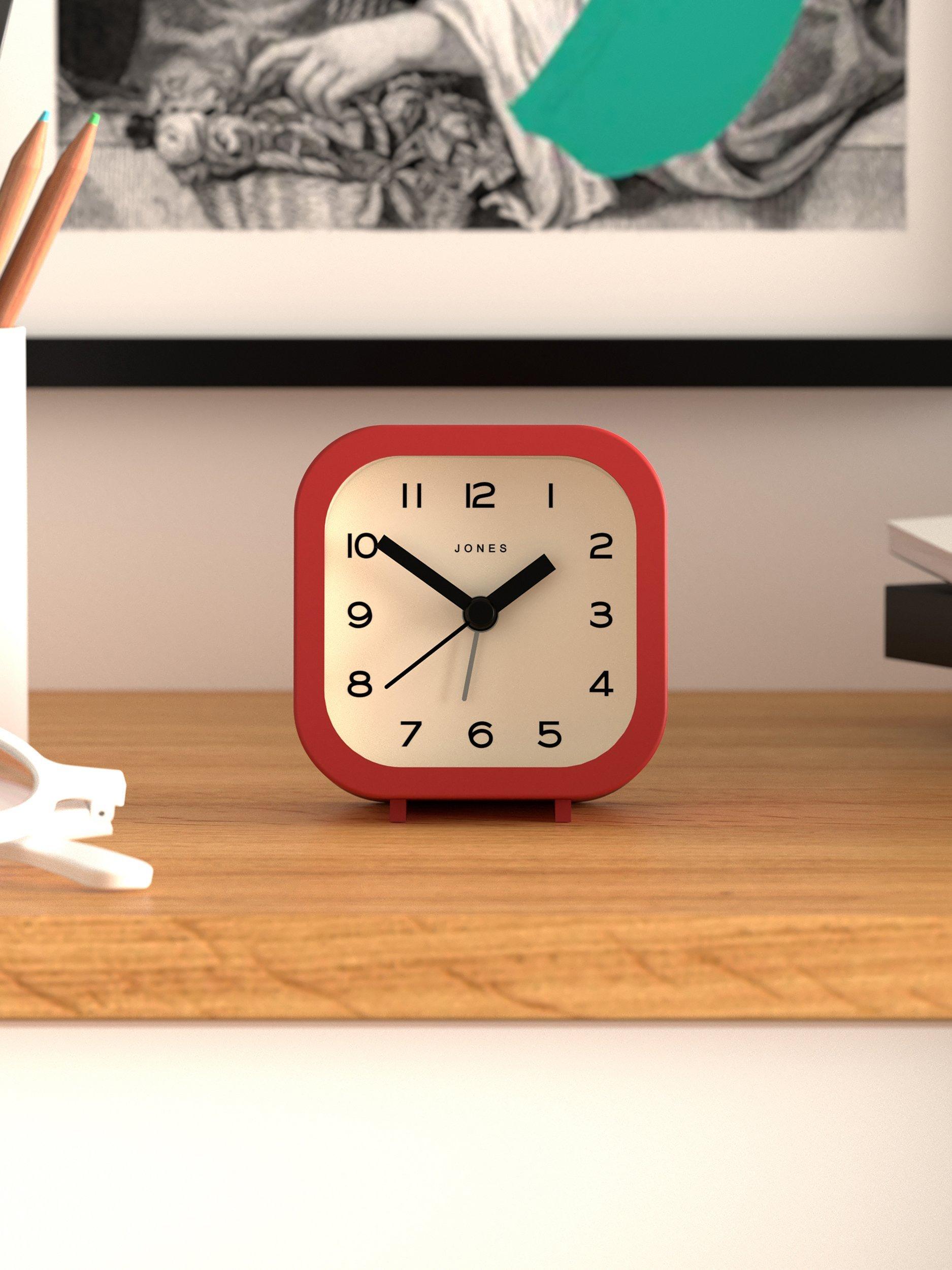 A contemporary and minimalist design, the Jones Clocks Bob analogue alarm clock has an acrylic case, chunky clock hands, gentle ticking noise and easy-to-read Arabic numerals marking the hours. This compact square design is sized to fit a bedside or office table.