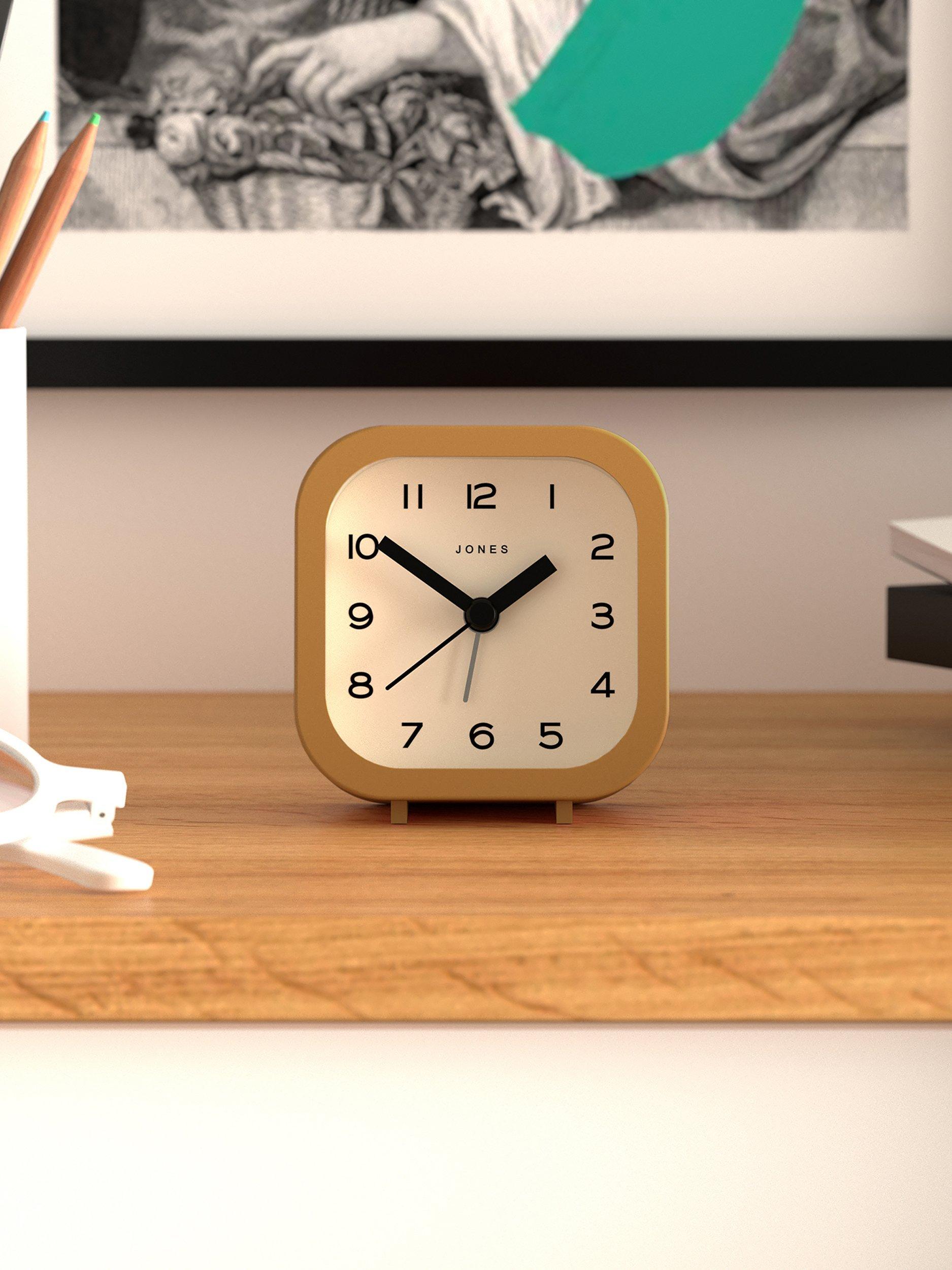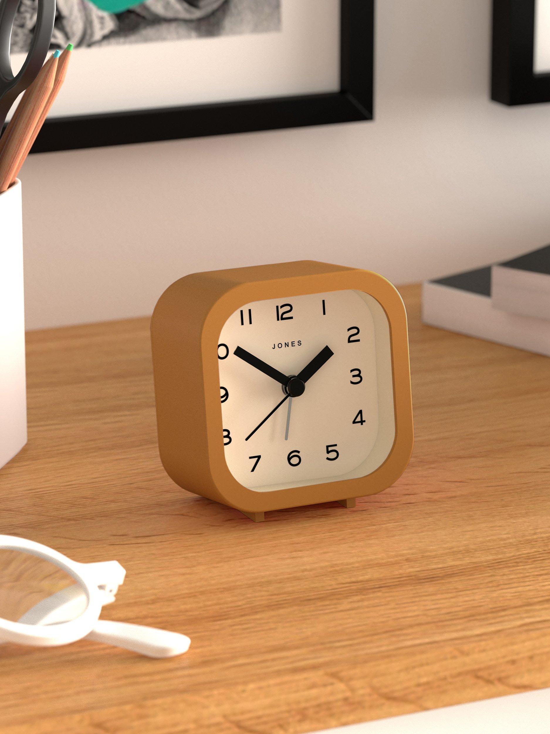 A contemporary and minimalist design, the Jones Clocks Bob analogue alarm clock has an acrylic case, chunky clock hands, gentle ticking noise and easy-to-read Arabic numerals marking the hours. This compact square design is sized to fit a bedside or office table.