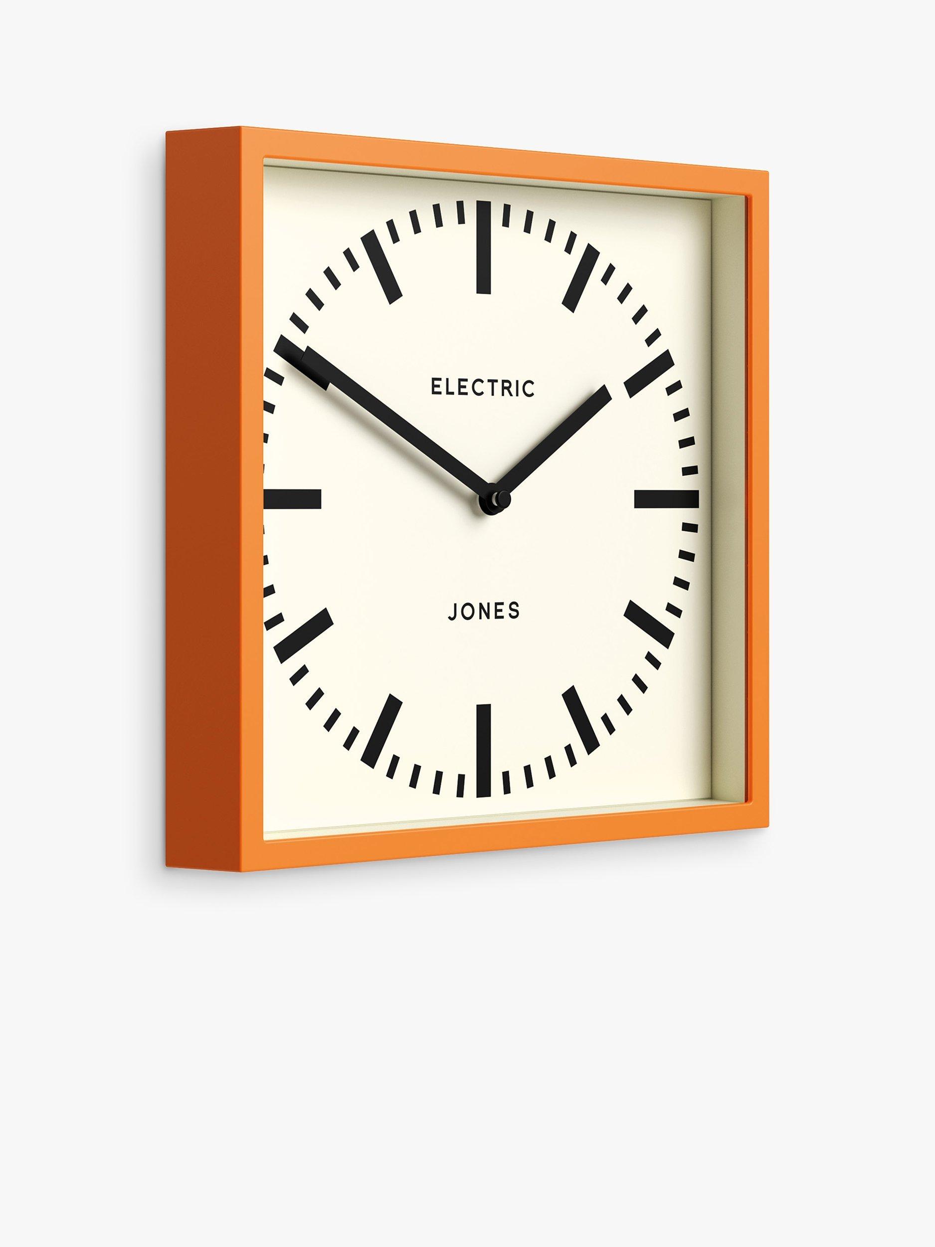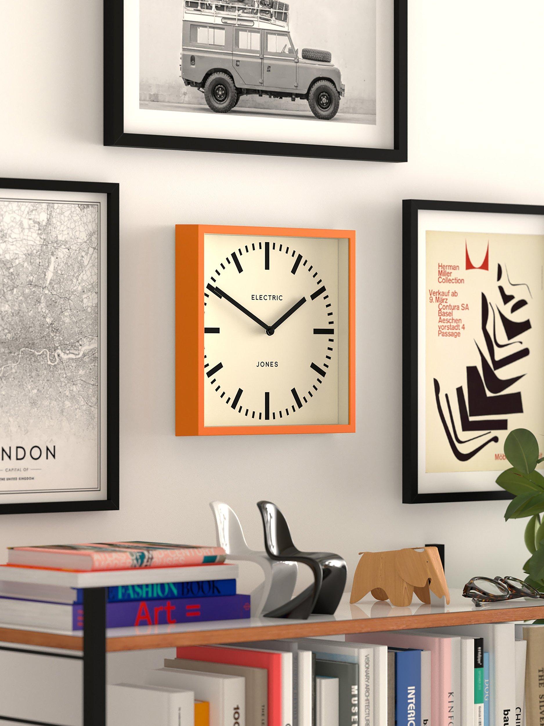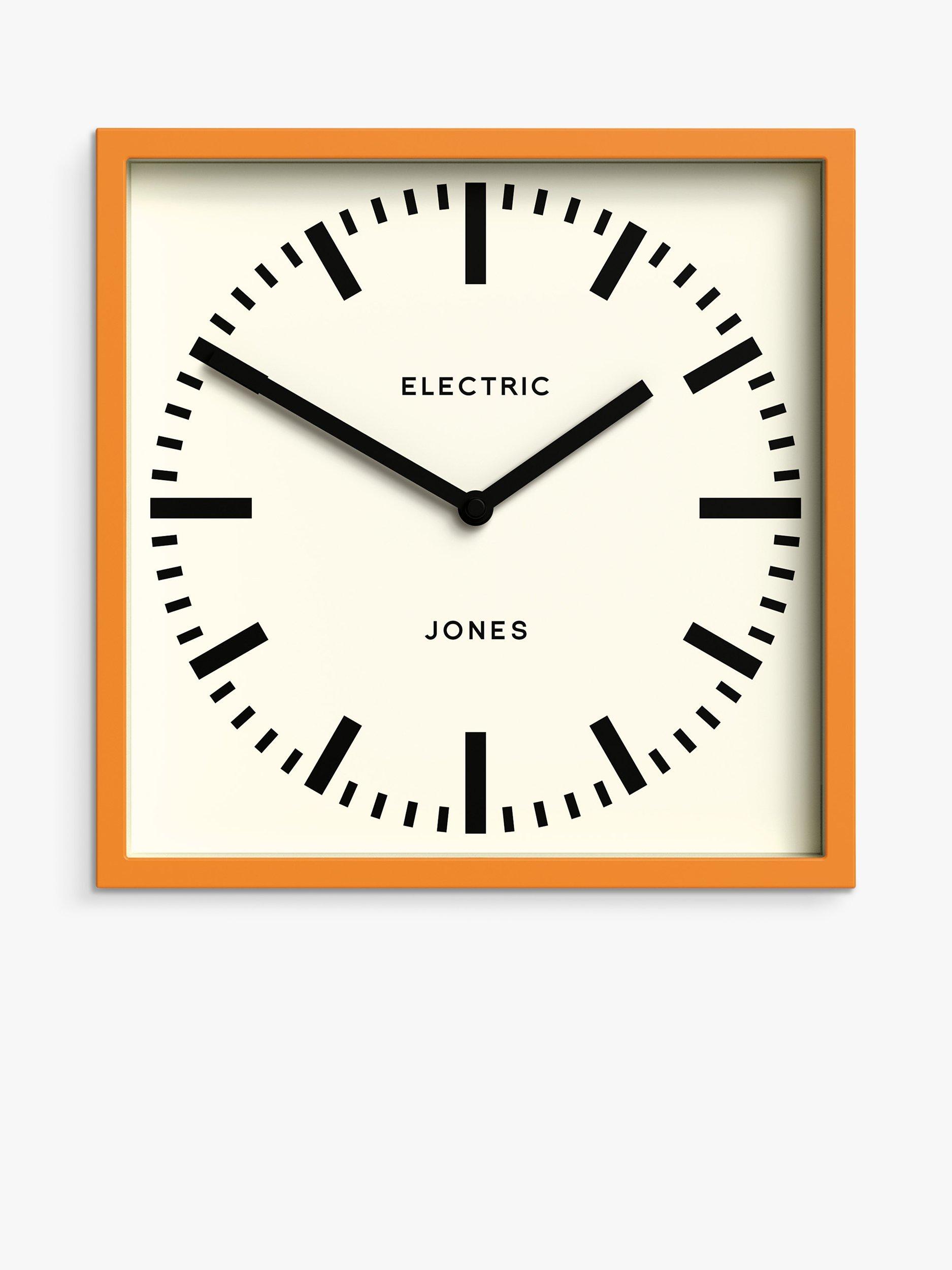A minimalist retro design from Jones Clocks, the Electric wall clock has a square-shaped colourful casing. Simple black markers and matching hands form the dial.