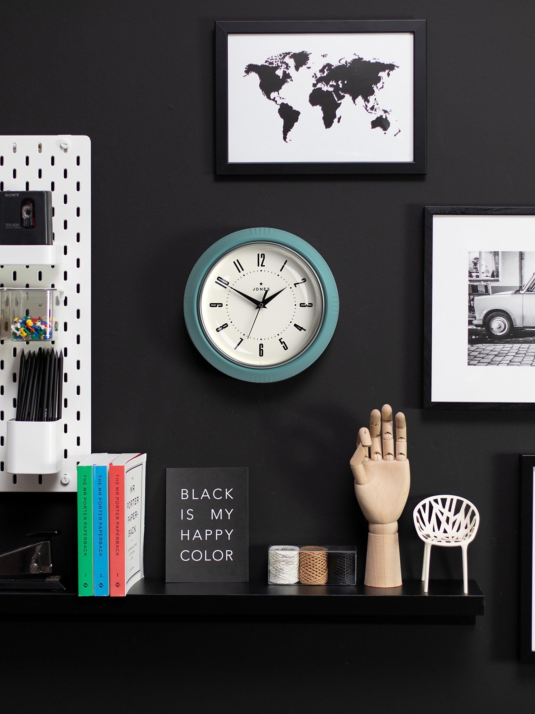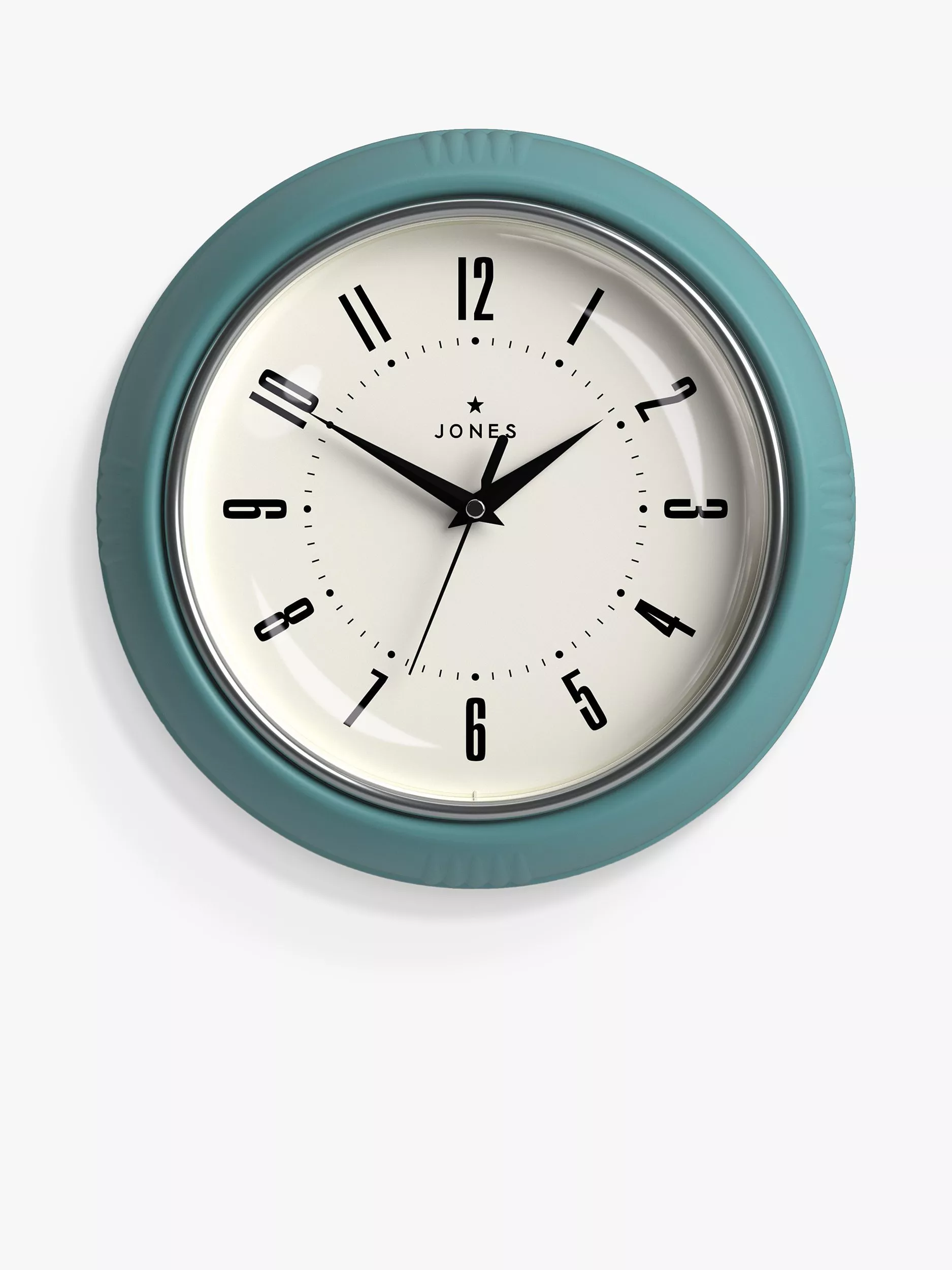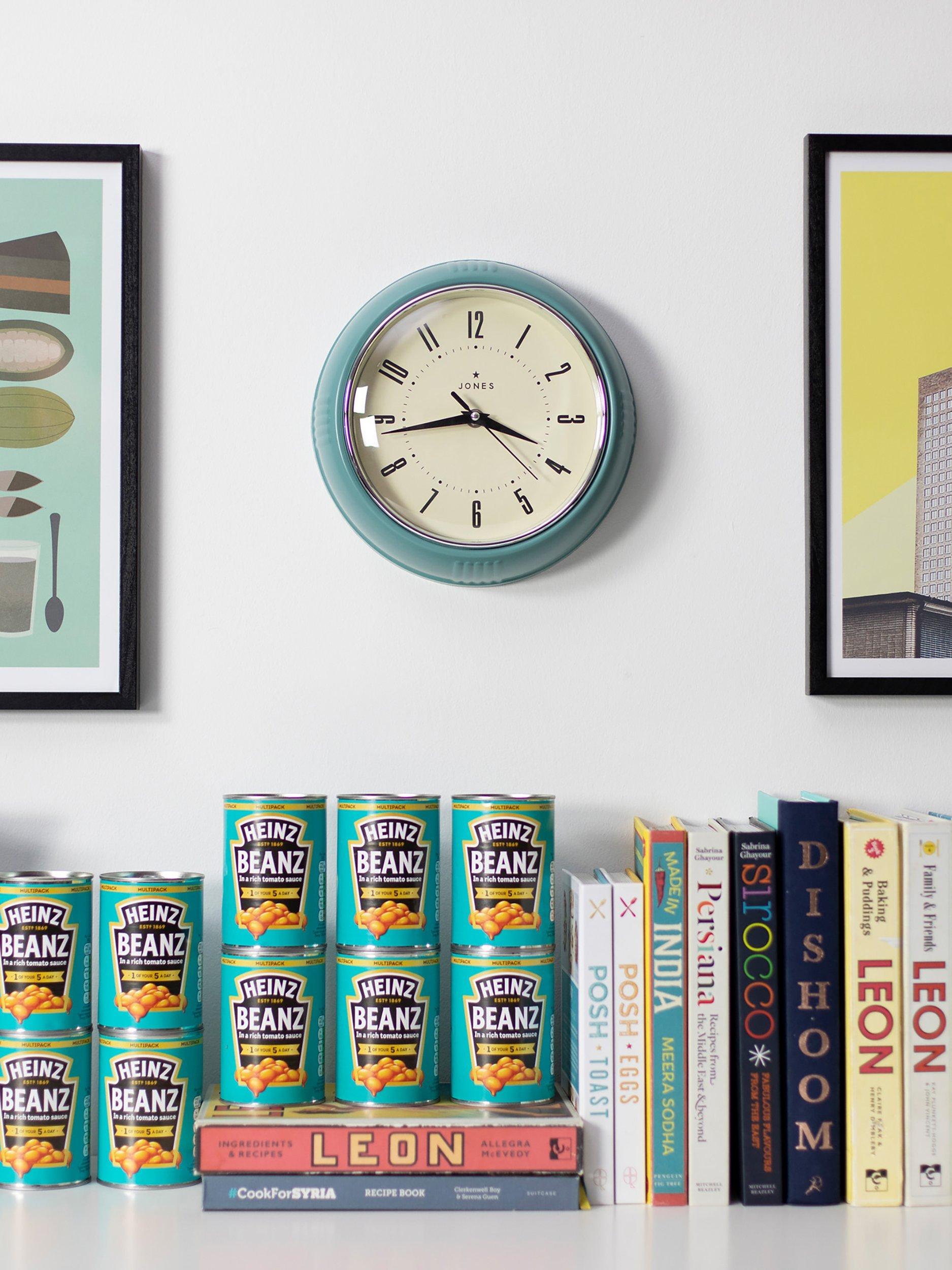 The round retro dial of the Ketchup clock from Jones Clocks has a deep casing, metallic bezel and compass clock hands behind a convex glass lens. Easy-to-read Arabic numerals mark the hours.