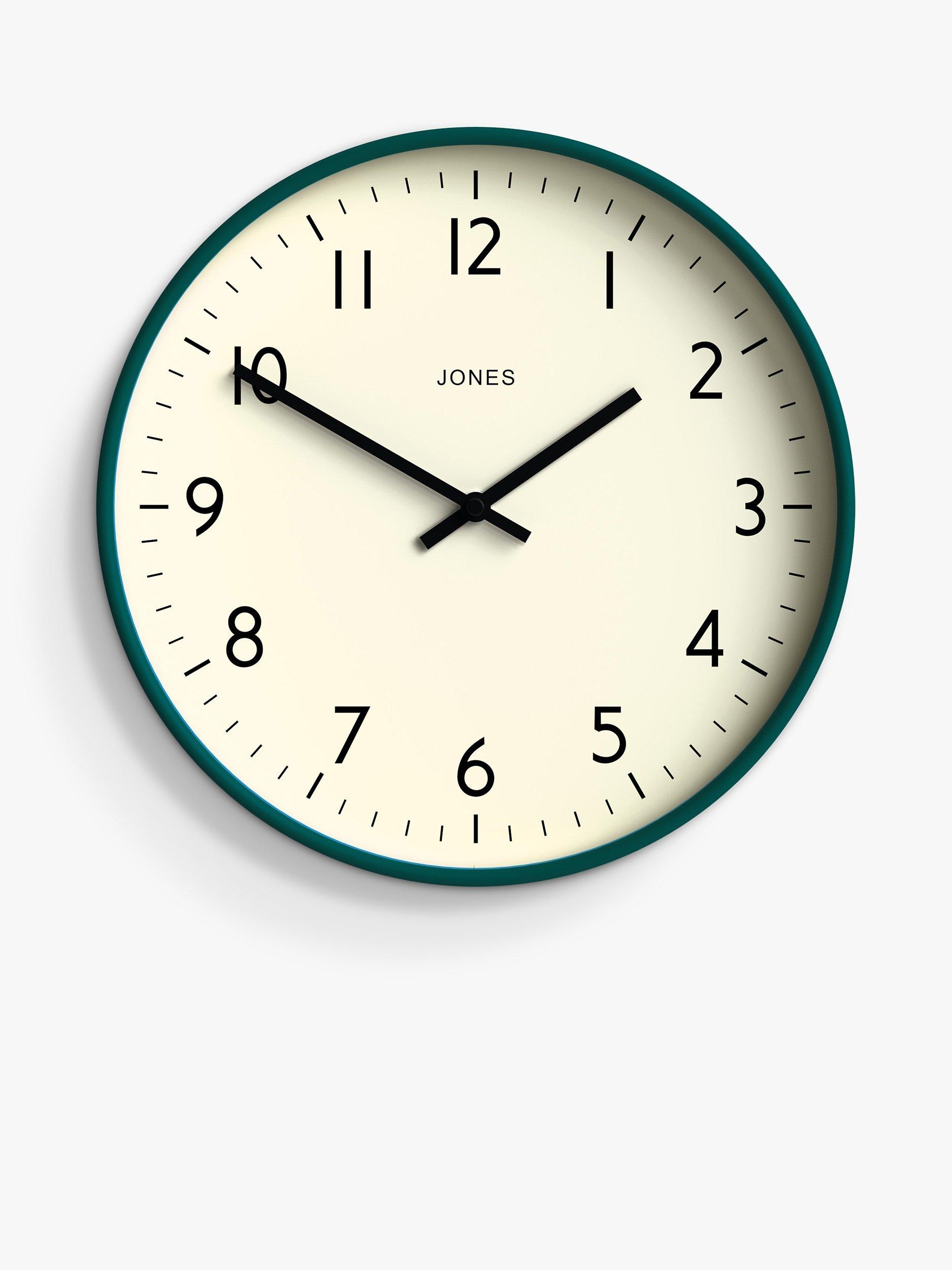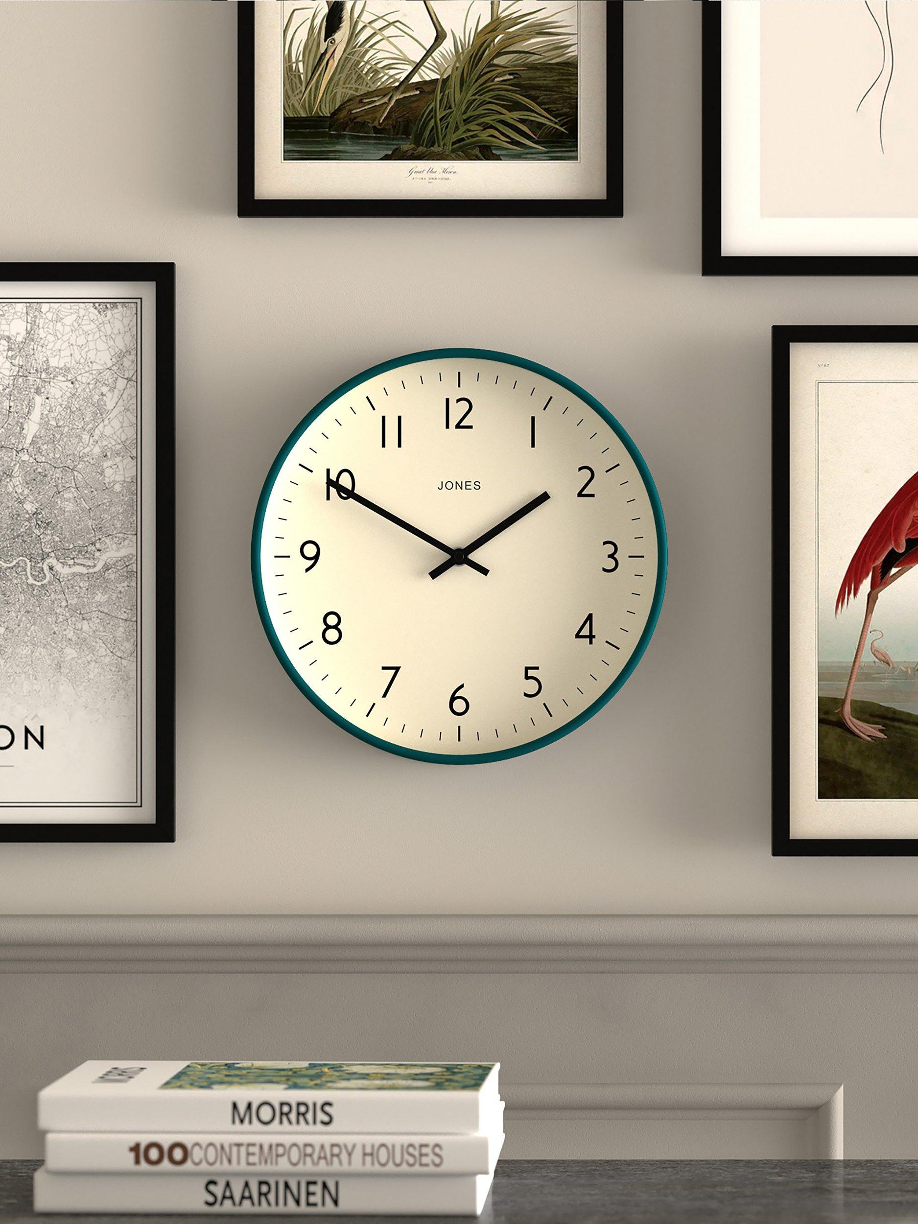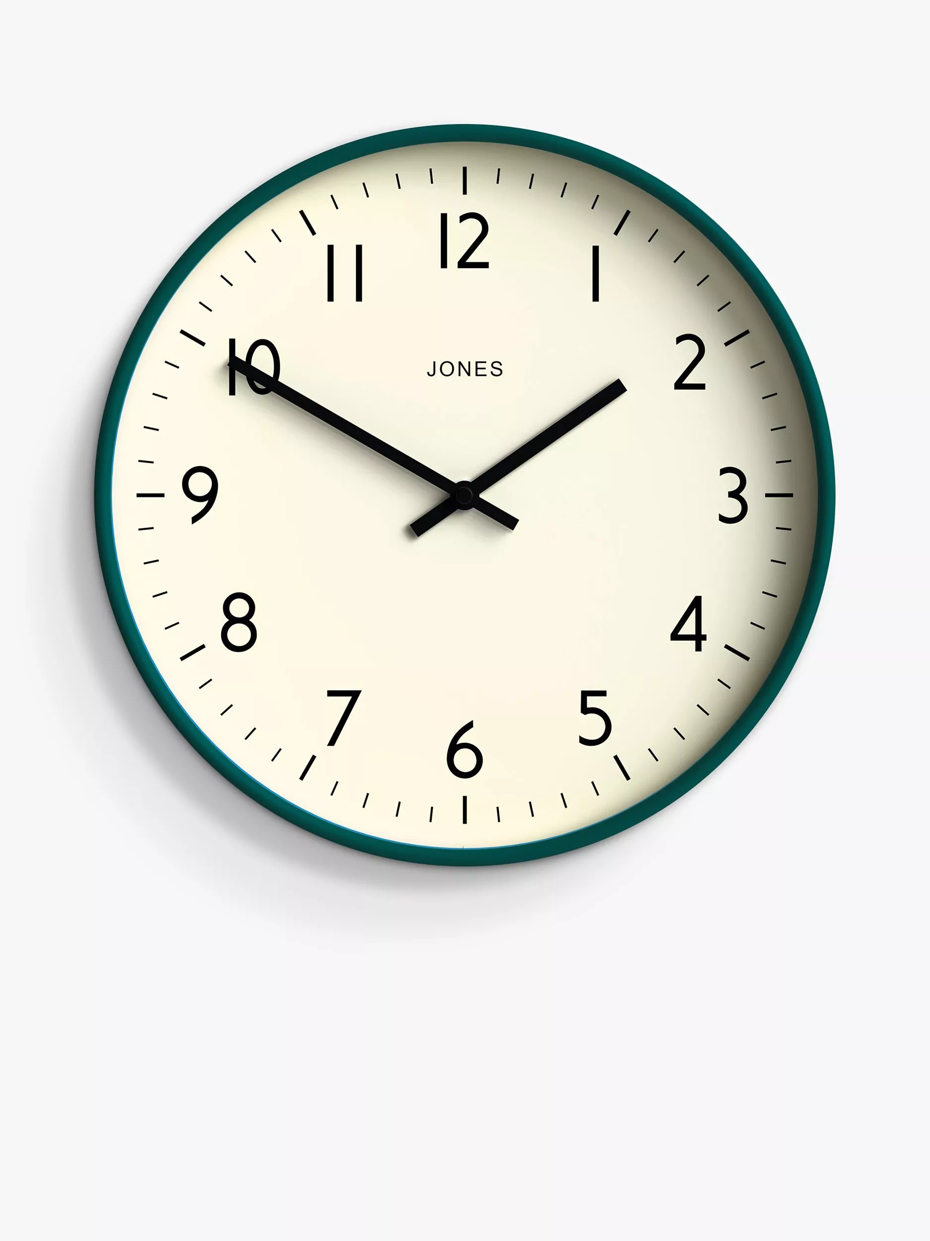 Bright and colourful, this Jones Clocks analogue wall clock has an easy-to-read dial. The simple, modern design is finished with linear clock hands behind a glass lens.