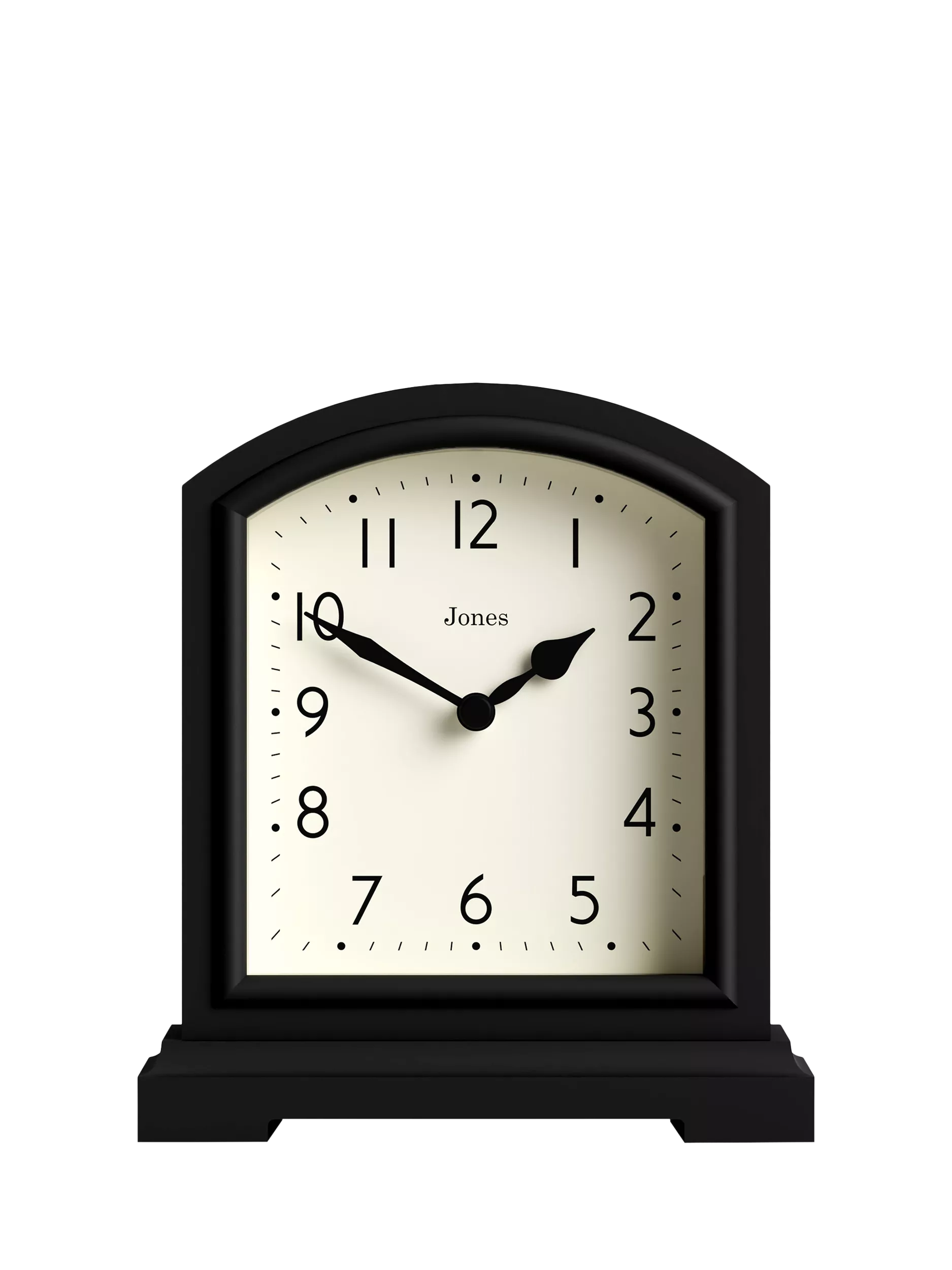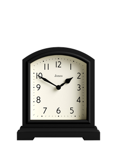 A classic mantel clock from Jones Clocks in a matt finish with a pretty Arabic numeral dial, metal hands and a glass lens. Ideal for adding style and function to a home office desk, mantelpiece or shelf. This ticking clock has quartz movement for energy-efficient precision time-keeping.