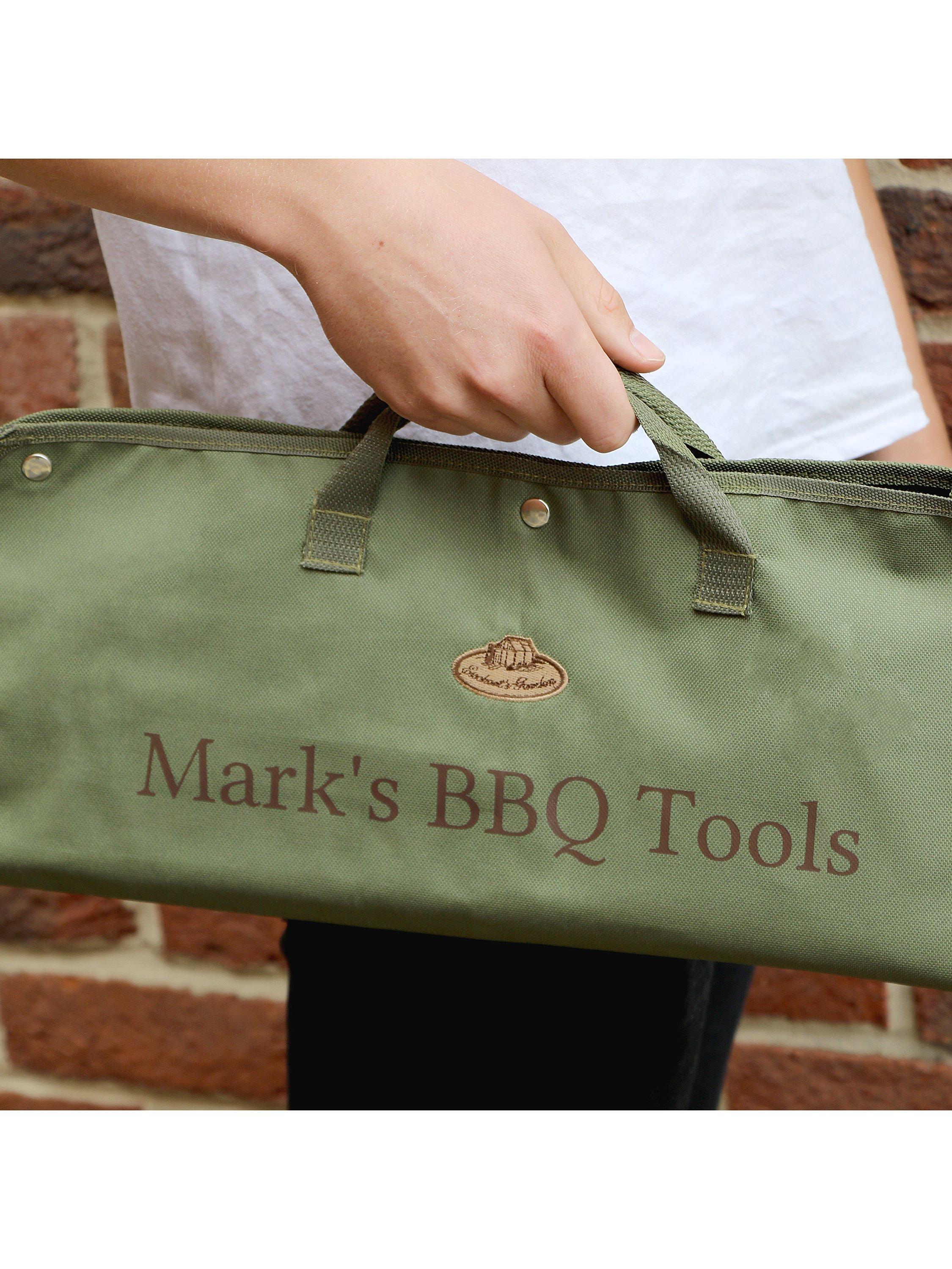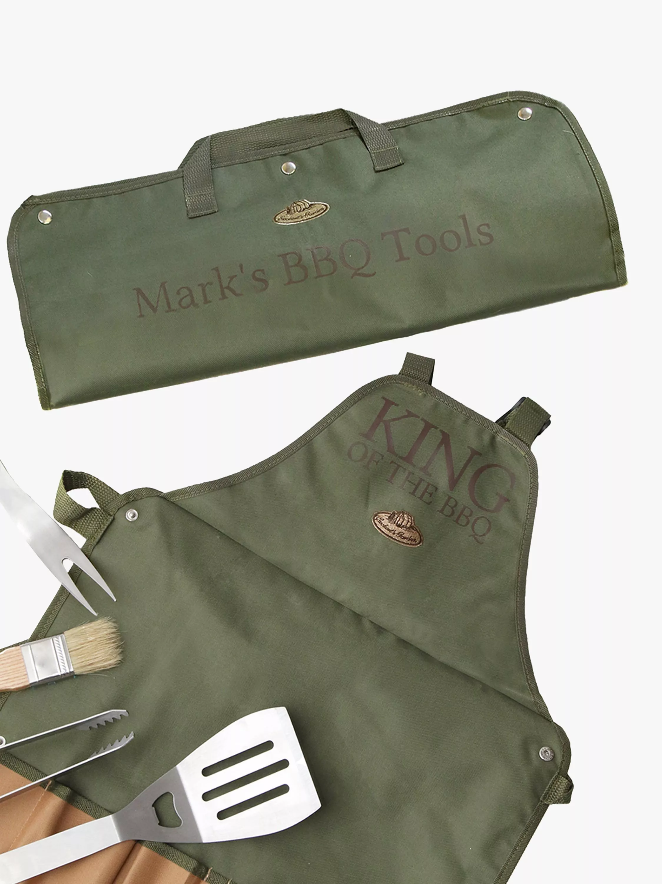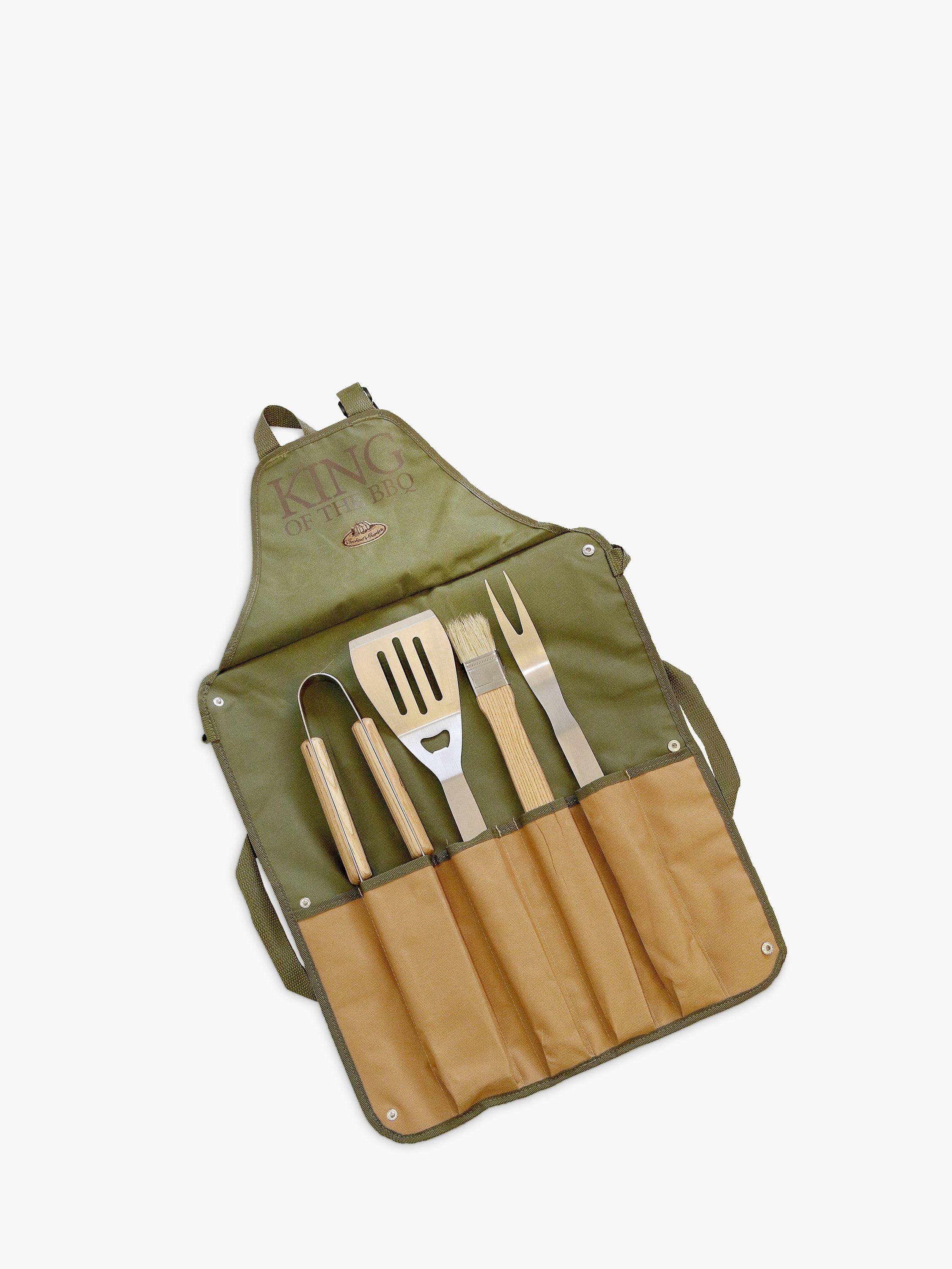 This handy tool set includes tongs, fork, spatula and brush and folds out to make a handy apron.