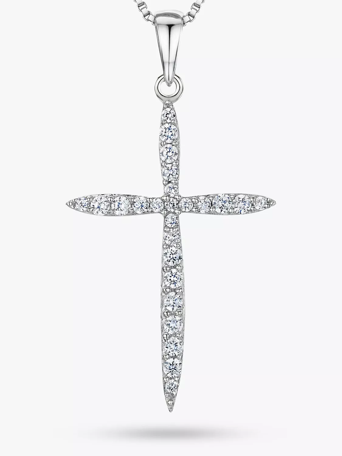 In a classic design, intricately crafted cubic zirconia stones have been set into a solid sterling silver frame shaped as a cross.