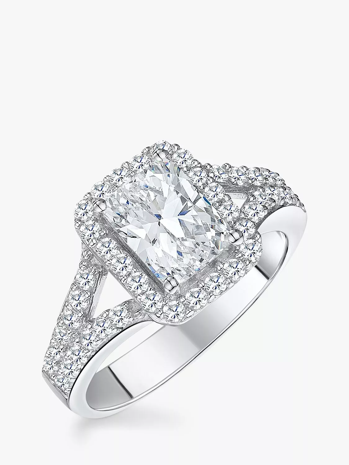 A sparkling finishing touch to your occasion outfit, this sterling silver and white cubic zirconia split shoulder ring is set with a princess cut centre stone with stone set shoulders.
