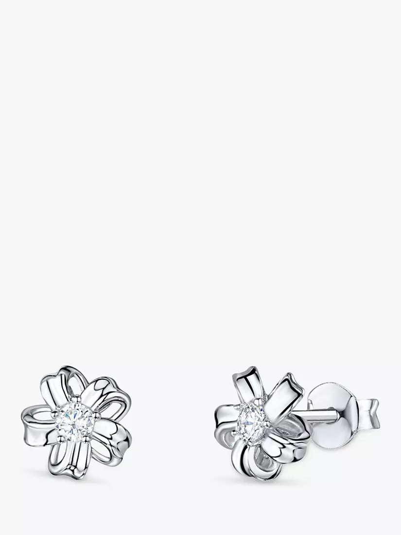 In sterling silver, the earrings present a dainty flower shape with open-work petals and a solitaire cubic zirconia at its centre. They fasten with butterfly posts that are for pierced ears only.