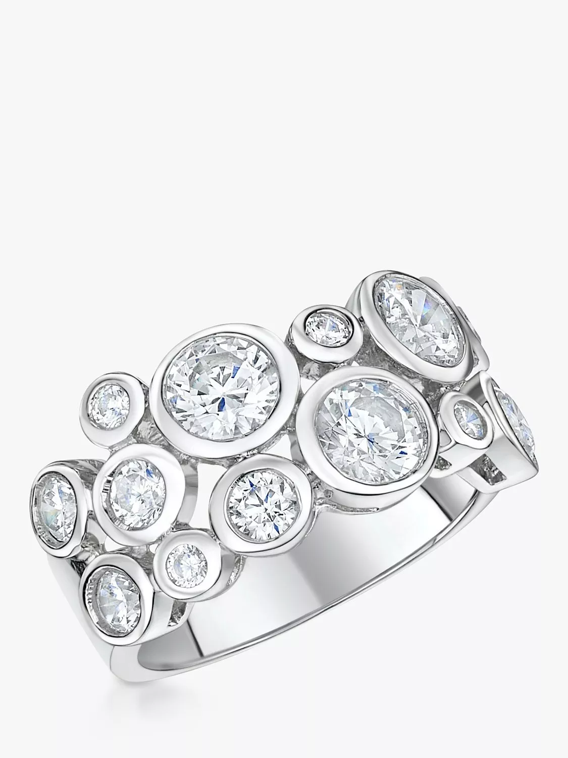 Made from sterling silver, this ring features varying sized AAA graded cubic zirconia gemstones for the ultimate shine. Rhodium finished for tarnish free wear.