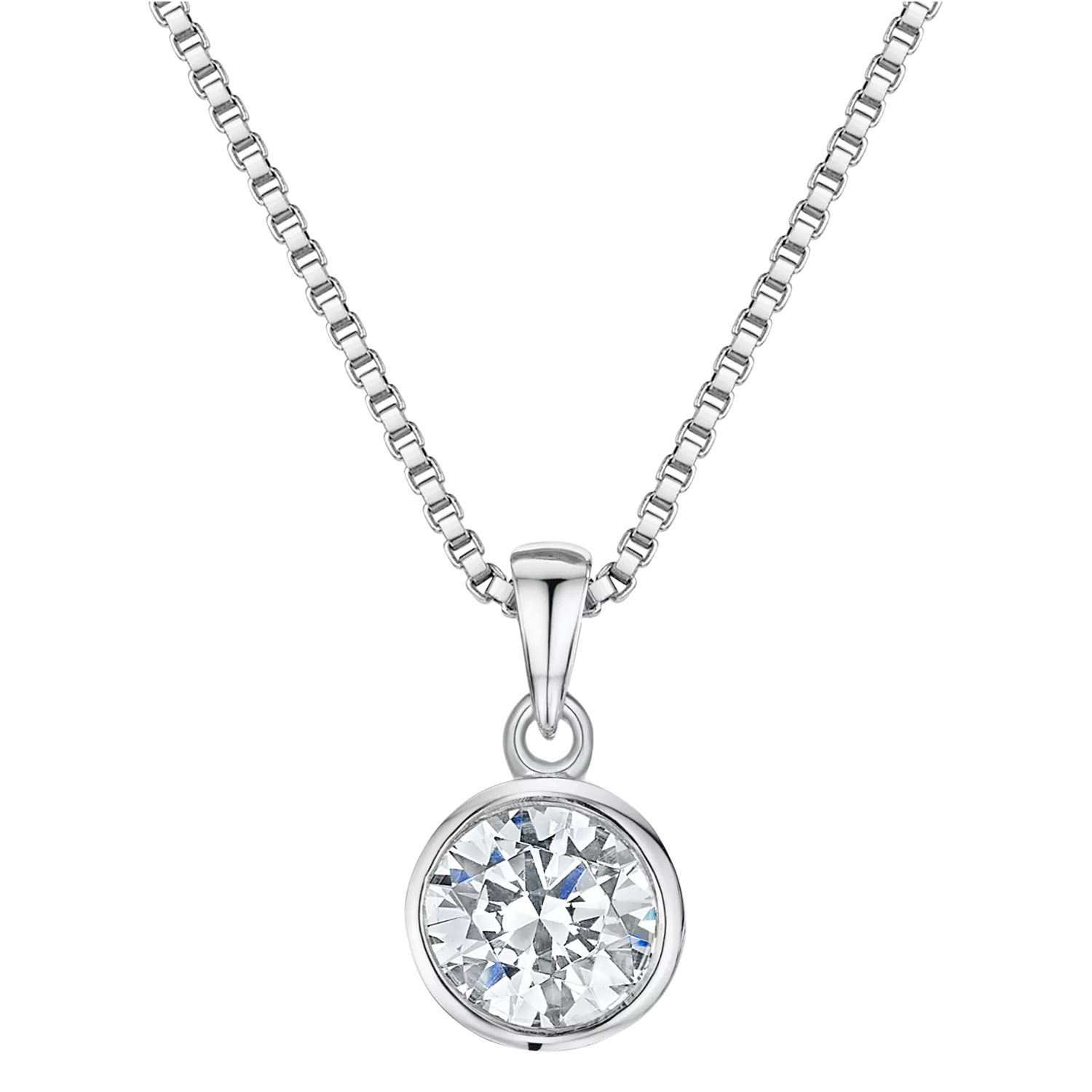 In a sparkling design, a large, expertly-crafted cubic zirconia stone has been set into a solid sterling silver circular pendant.