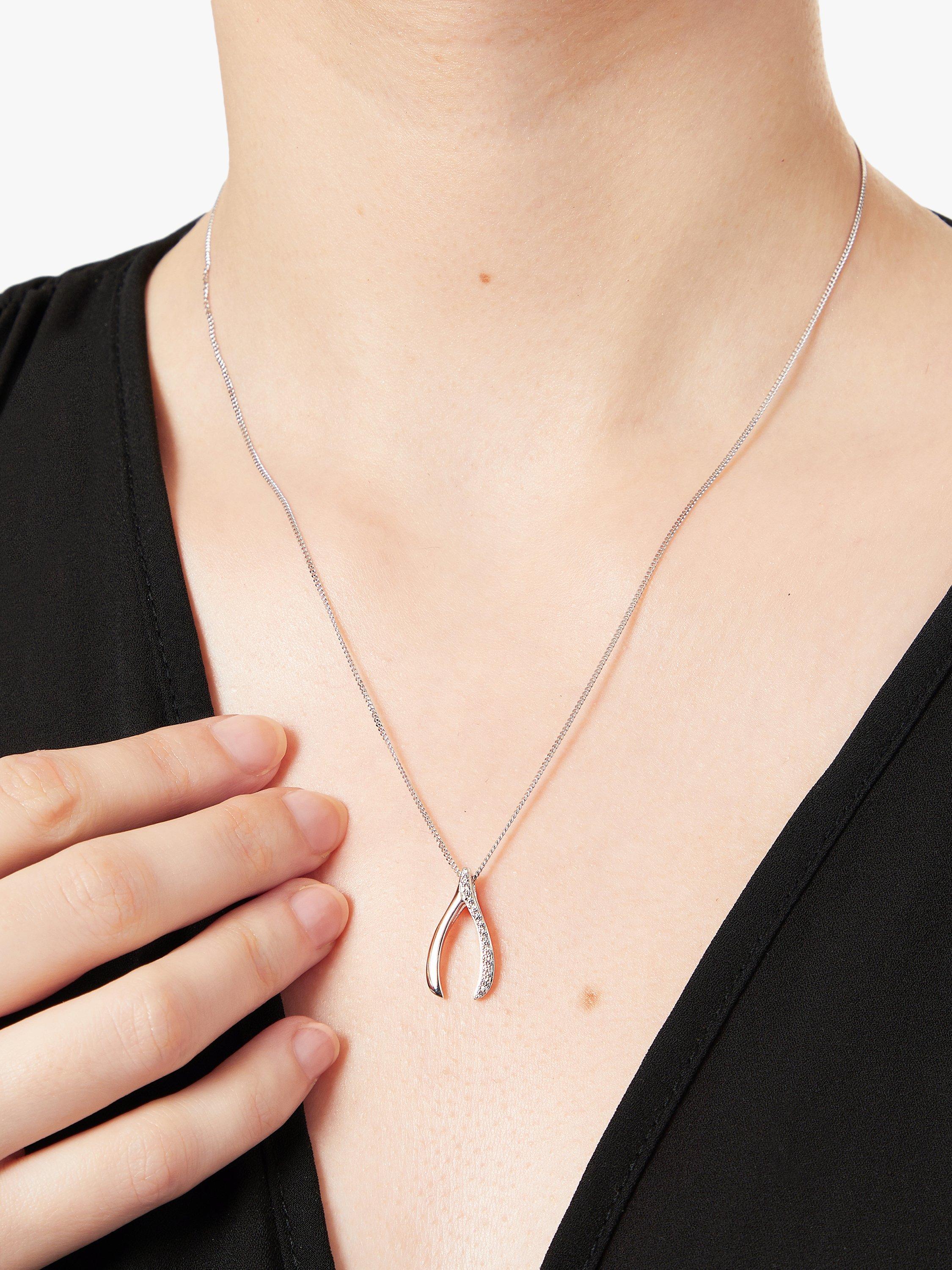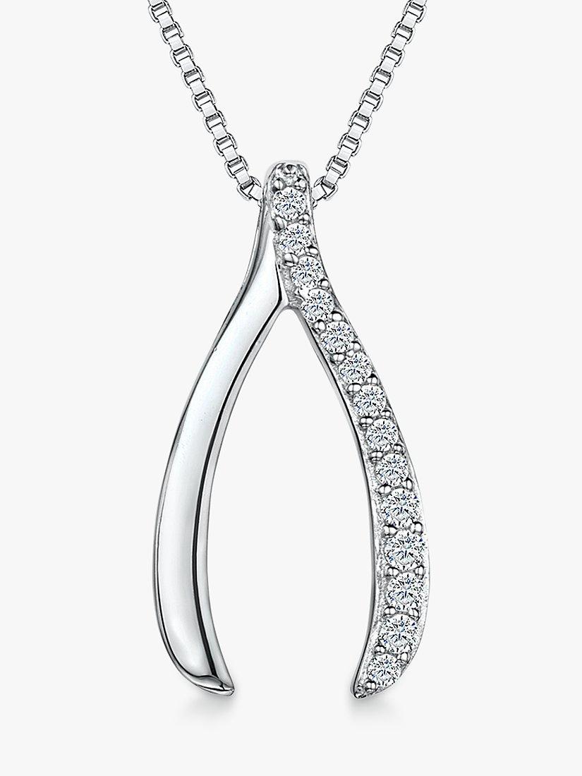 In a simple but eye-catching design, glistening cubic zirconia stones adorn one side of a sterling silver wishbone pendant, which has been suspended on a delicate chain.