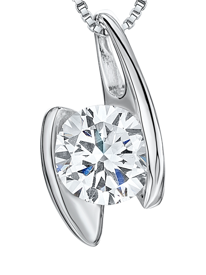 This sterling silver, rhodium finish pendant is set with a brilliant cut 2 carat round cubic zirconia stone held between offset silver bars.