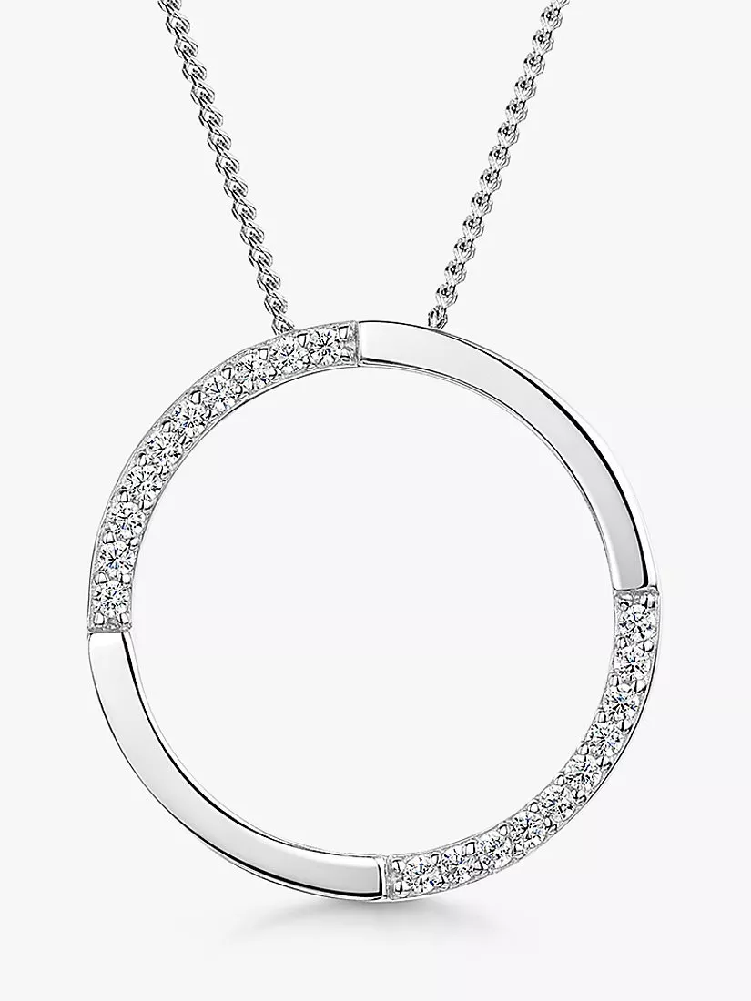 Simple, but beautiful, this necklace from Jools by Jenny Brown features a sterling silver polished open circle pendant set with two-quarters of 1.5mm round brilliant cut cubic zirconia stones.