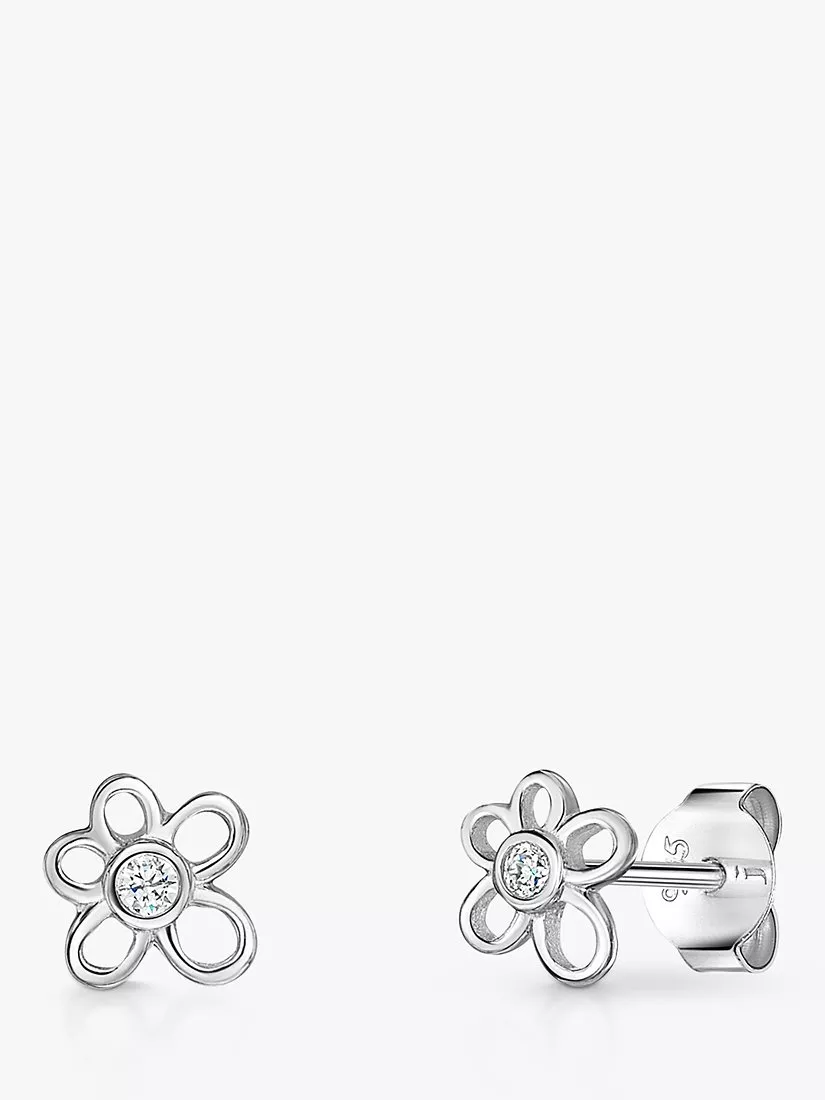 Delicate stud earrings designed in a small flower shape with a sparkly cubic zirconia centre. For pierced ears only.