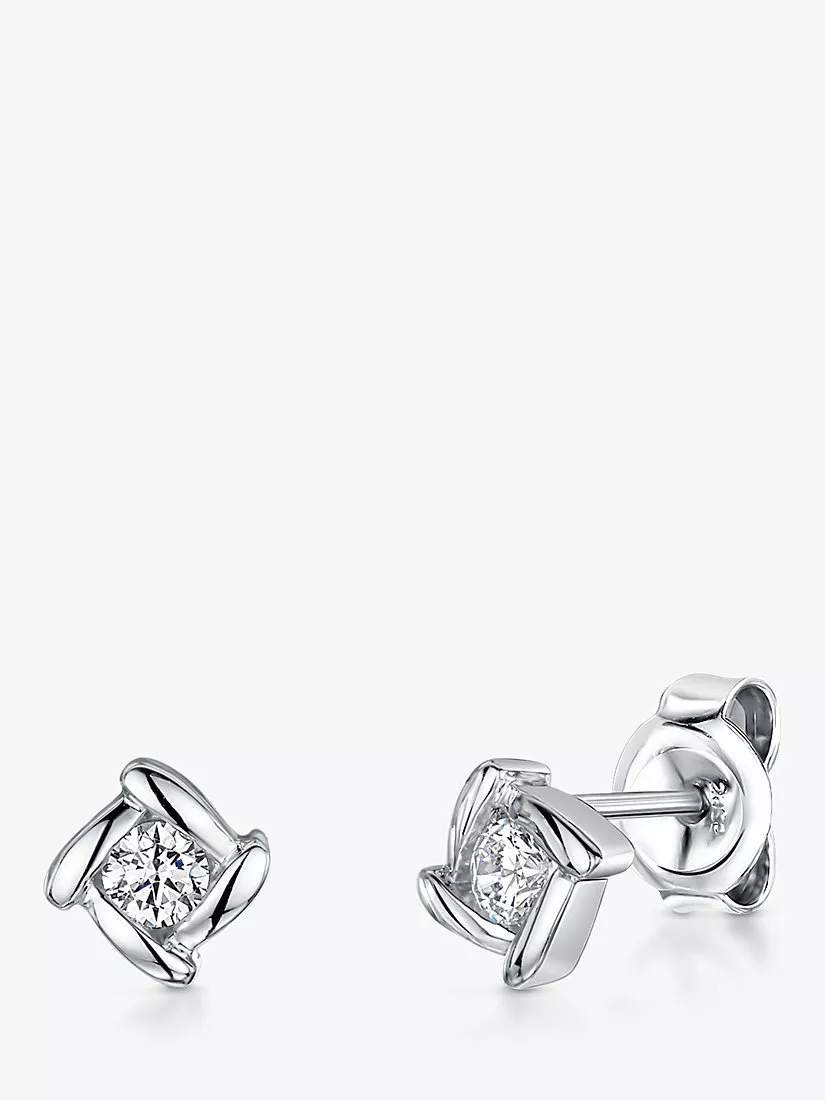 An interesting pair of stud earrings, featuring a single diamond cut cubic zirconia stone, set in a polished overlapping square frame. Perfect for adding a polished finished to any outfit.