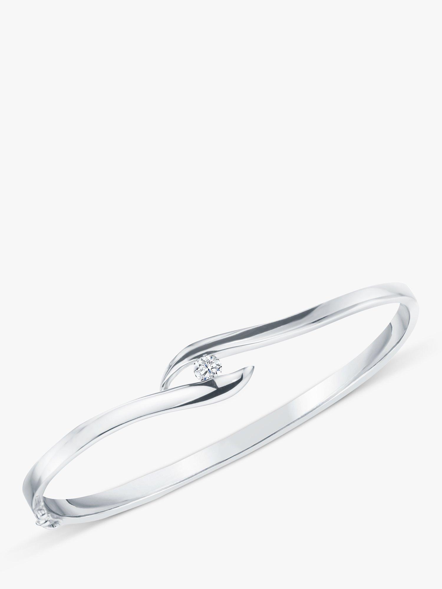 A simple yet elegant bangle from Jools by Jenny Brown. Featuring a high polished rhodium plated silver bangle, that finishes off with what looks like 2 open palms, gently holding a sparkling cubic zirconia in the center. Perfect for adding a little sparkle to your everyday wear.