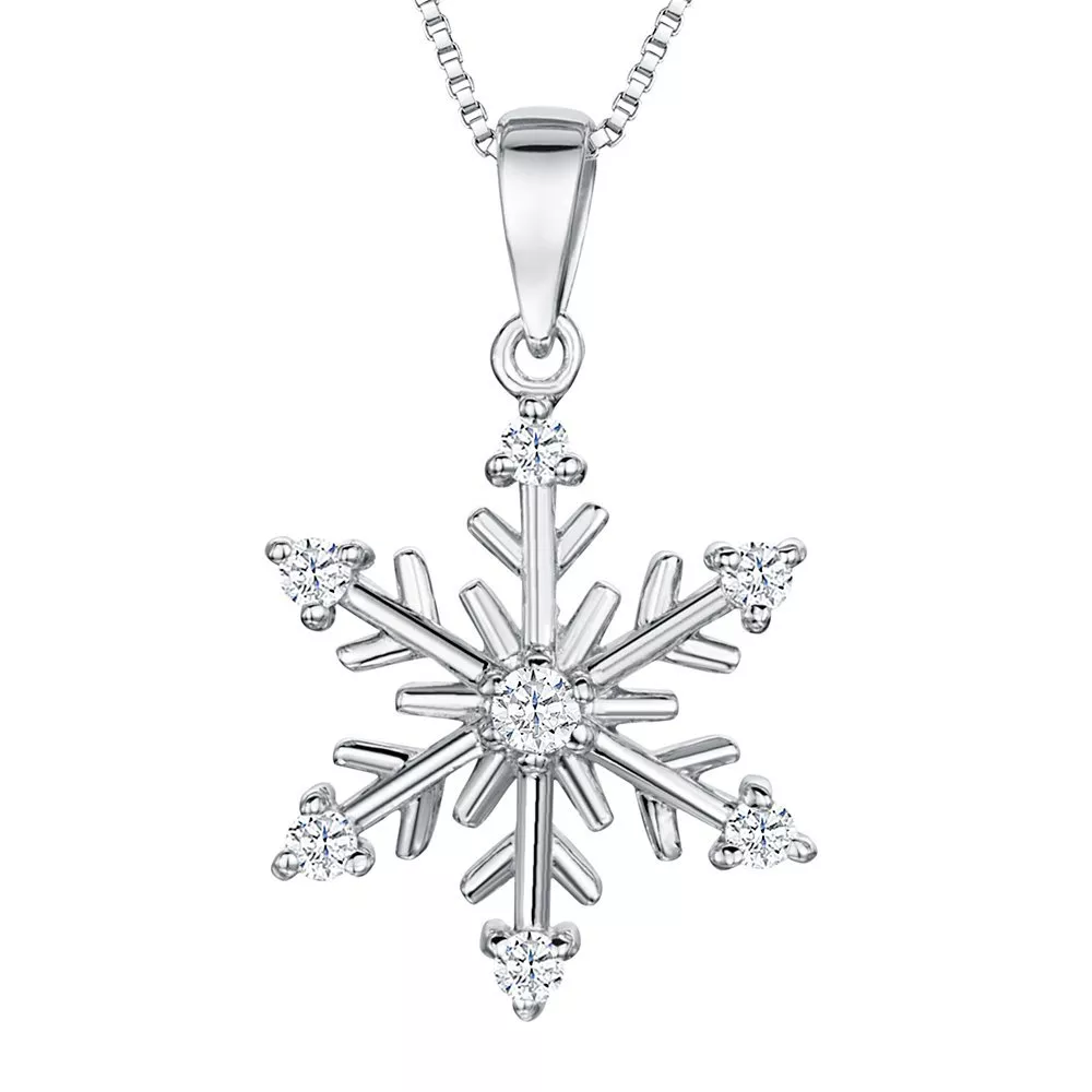 A sterling silver snowflake pendant, with glittering cubic zirconia set at its center and tips. On a sterling silver chain, the pendant is plated with rhodium, for a brilliant silvery-white finish.