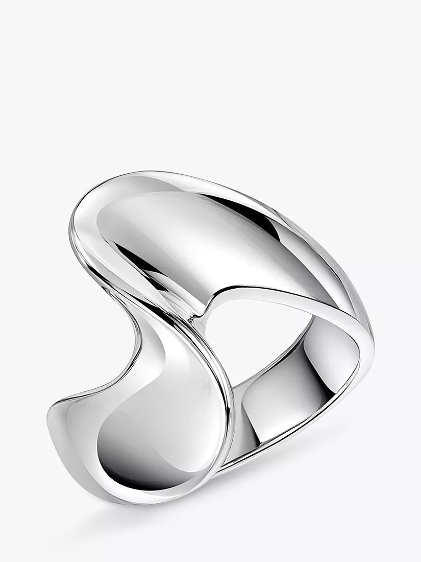 A ring with a twist. This polished band ring is made from sterling silver and has a rhodium finish for tarnish free wear.
