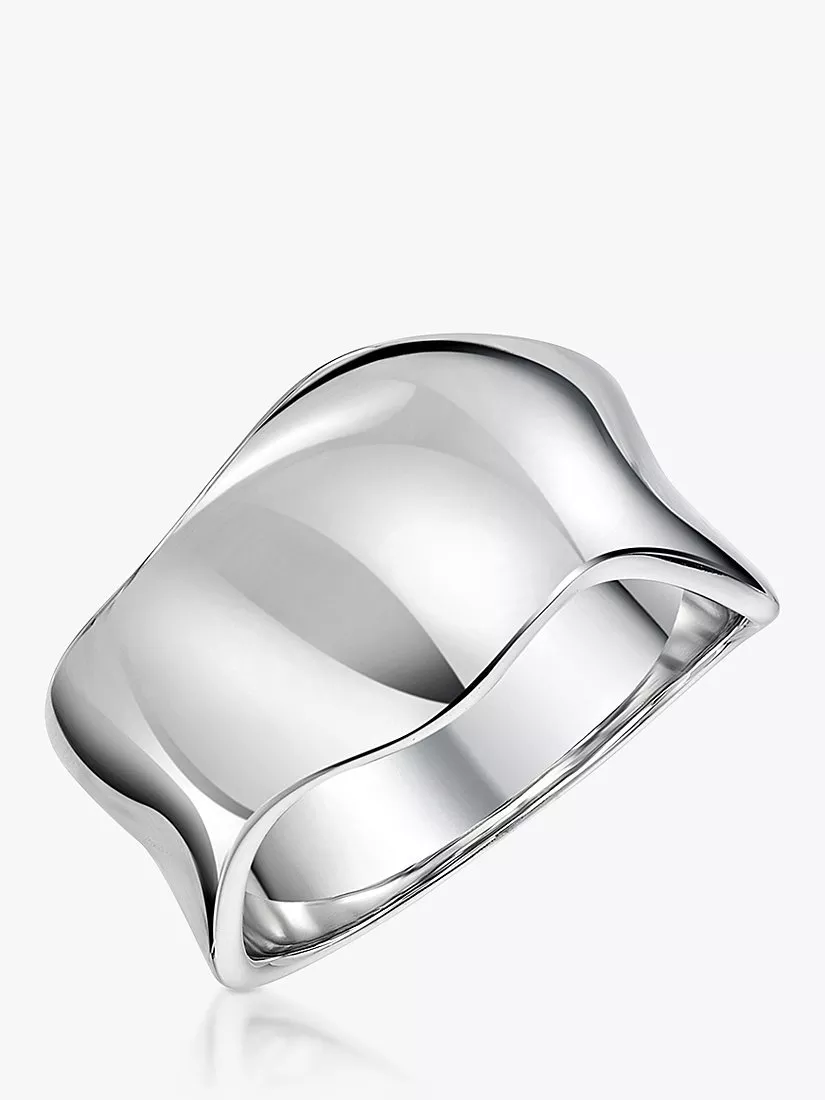 Inspired by the sea, this band ring has a wide, wavy concave design. Made from sterling silver with a rhodium finish for tarnish free wear.