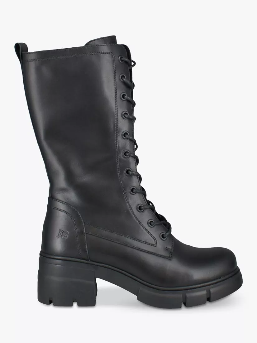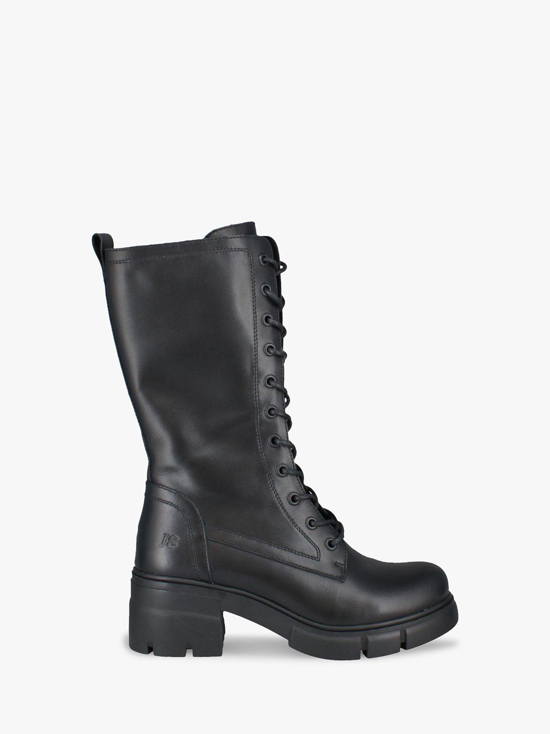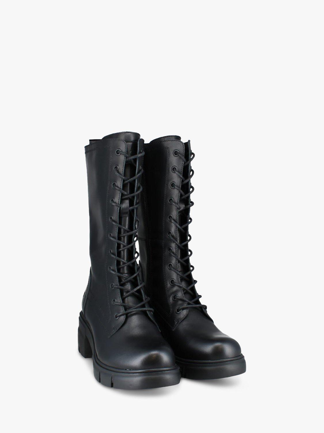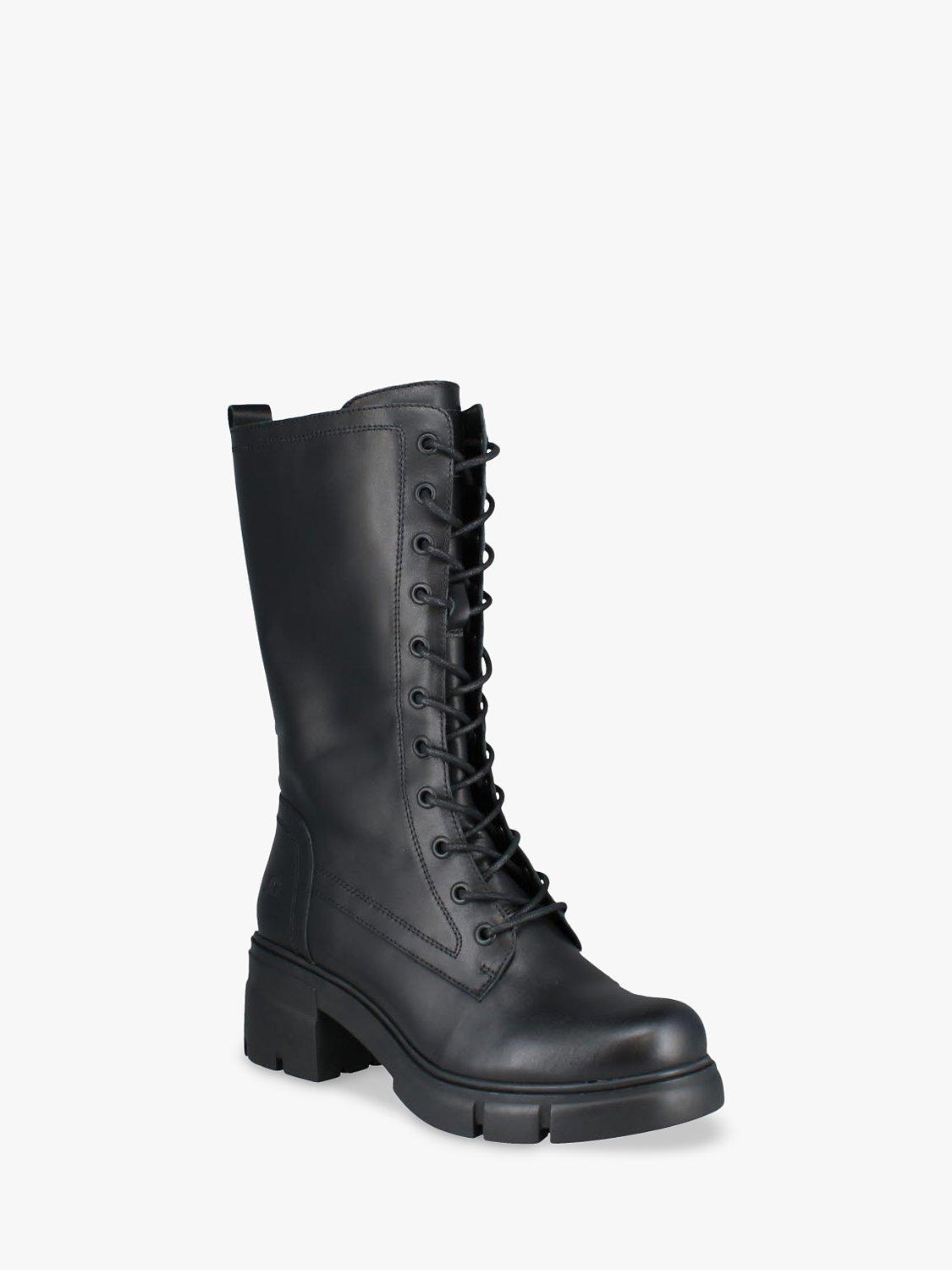 Leather boots in a high-leg, flattering design with chunky mid-height block heel for a comfortable wear. The lace-ups at the front are accented with metal eyelets for a utilitarian feel, while an inner zip makes dressing simple.