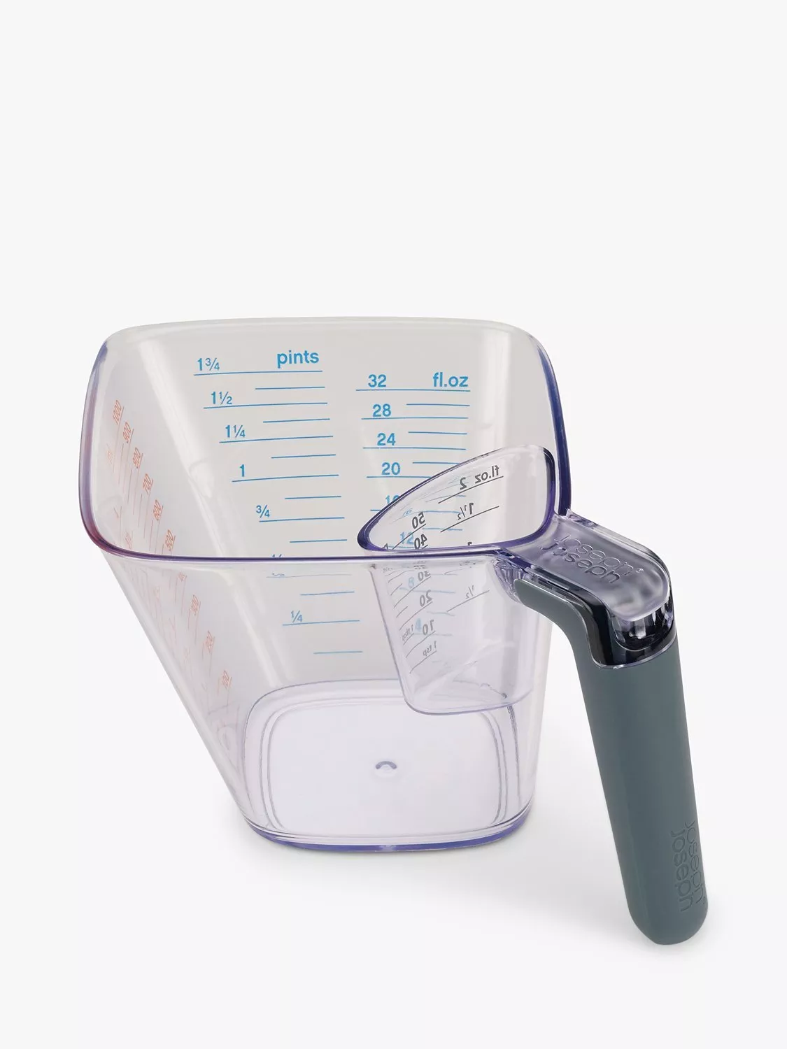 The angled design of the large jug allows you to read off the volume from above, without having to bend down to look at the measuring scale at the front.