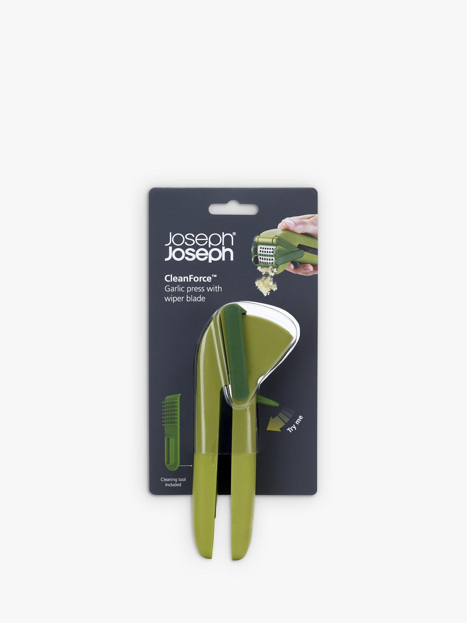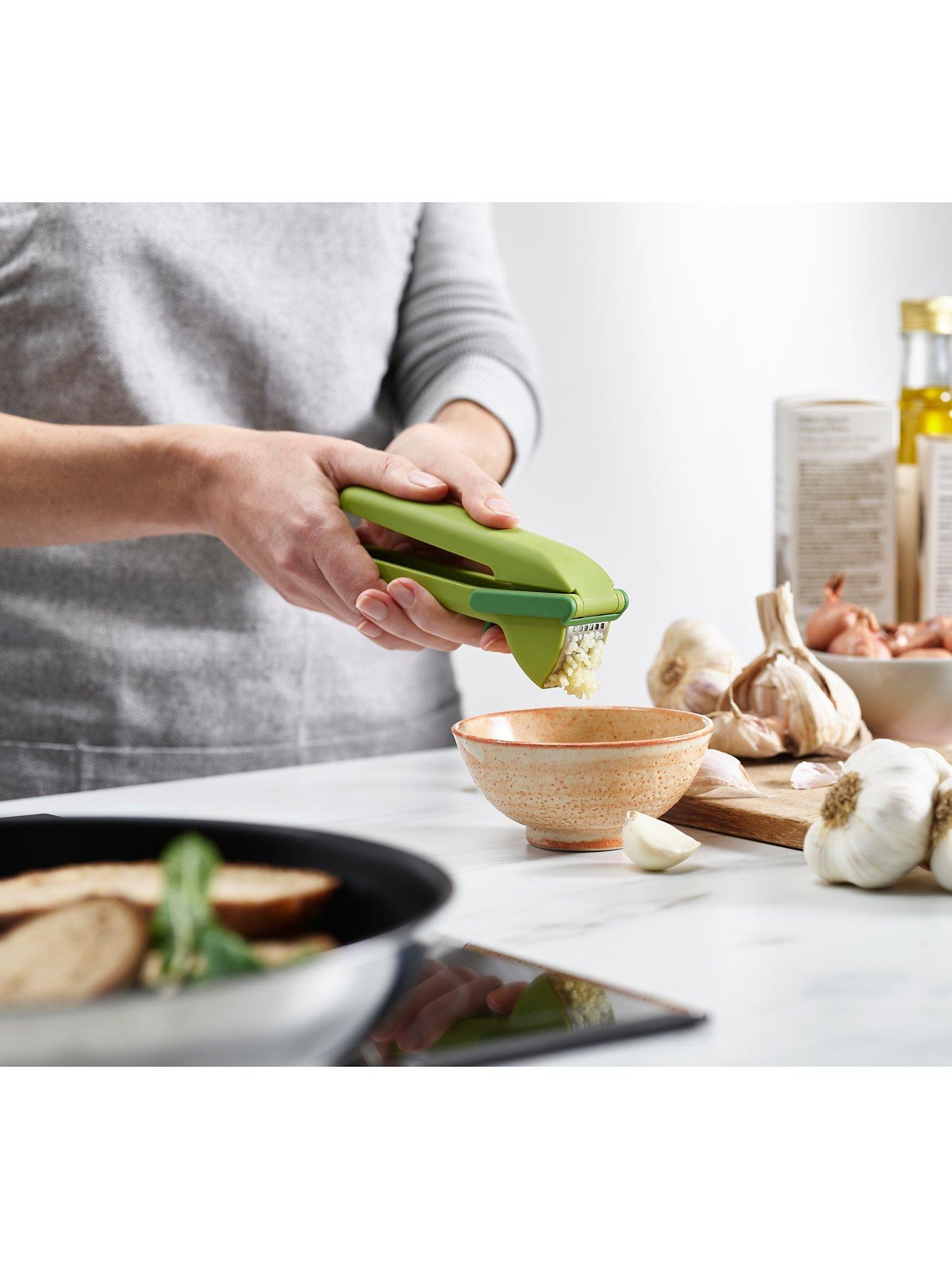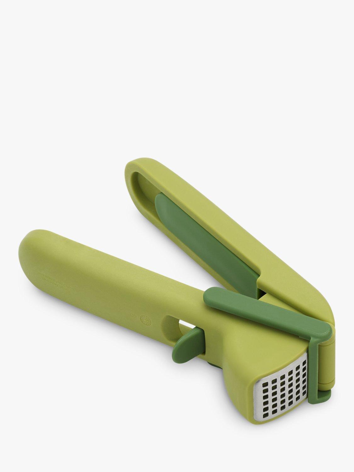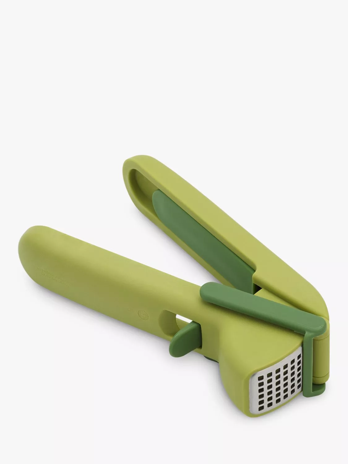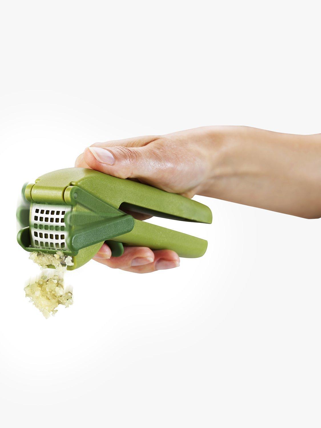 This powerful garlic press crushes cloves with ease and features a wiper blade and a handy scraping tool for easy cleaning. Just pop a clove or two inside the head and squeeze the handles to crush. To remove the crushed garlic, pull the trigger and the blade gently sweeps it free.