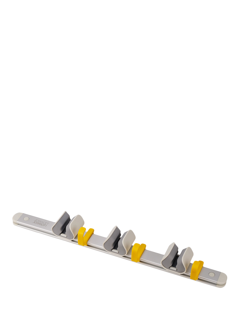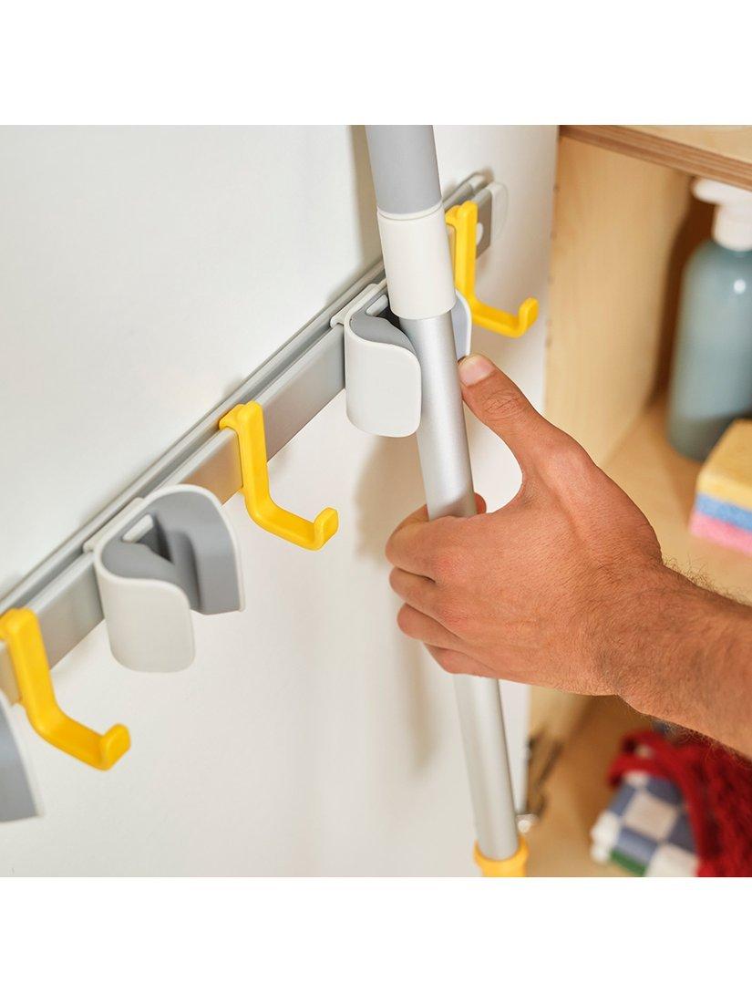 This practical and stylish storage rail provides an ideal solution for organising awkward cleaning tools neatly and efficiently. Crafted from high-quality aluminium, it features three adjustable hooks and three pole grips that can slide along the rail to fit variety of tools and accessories.