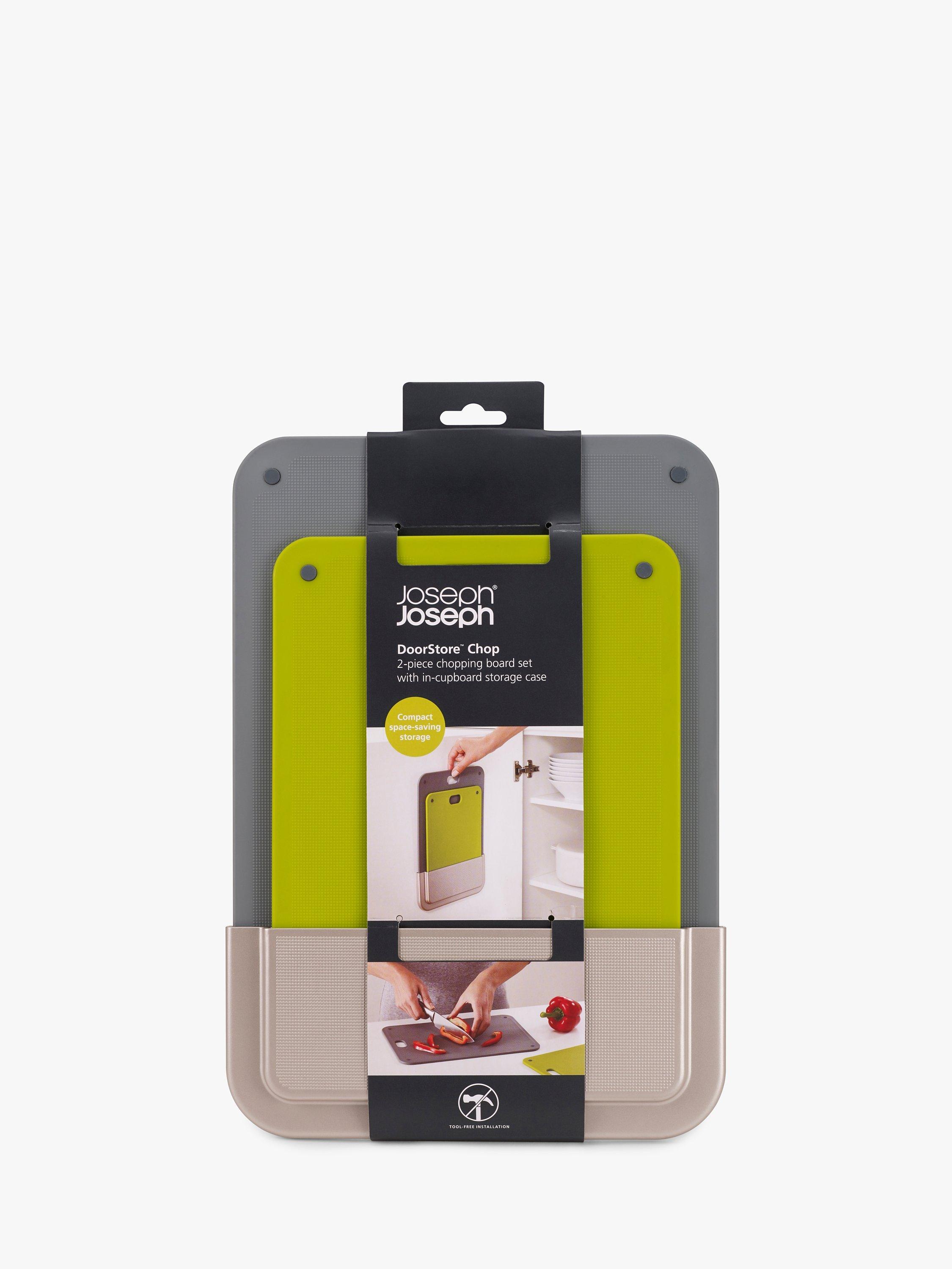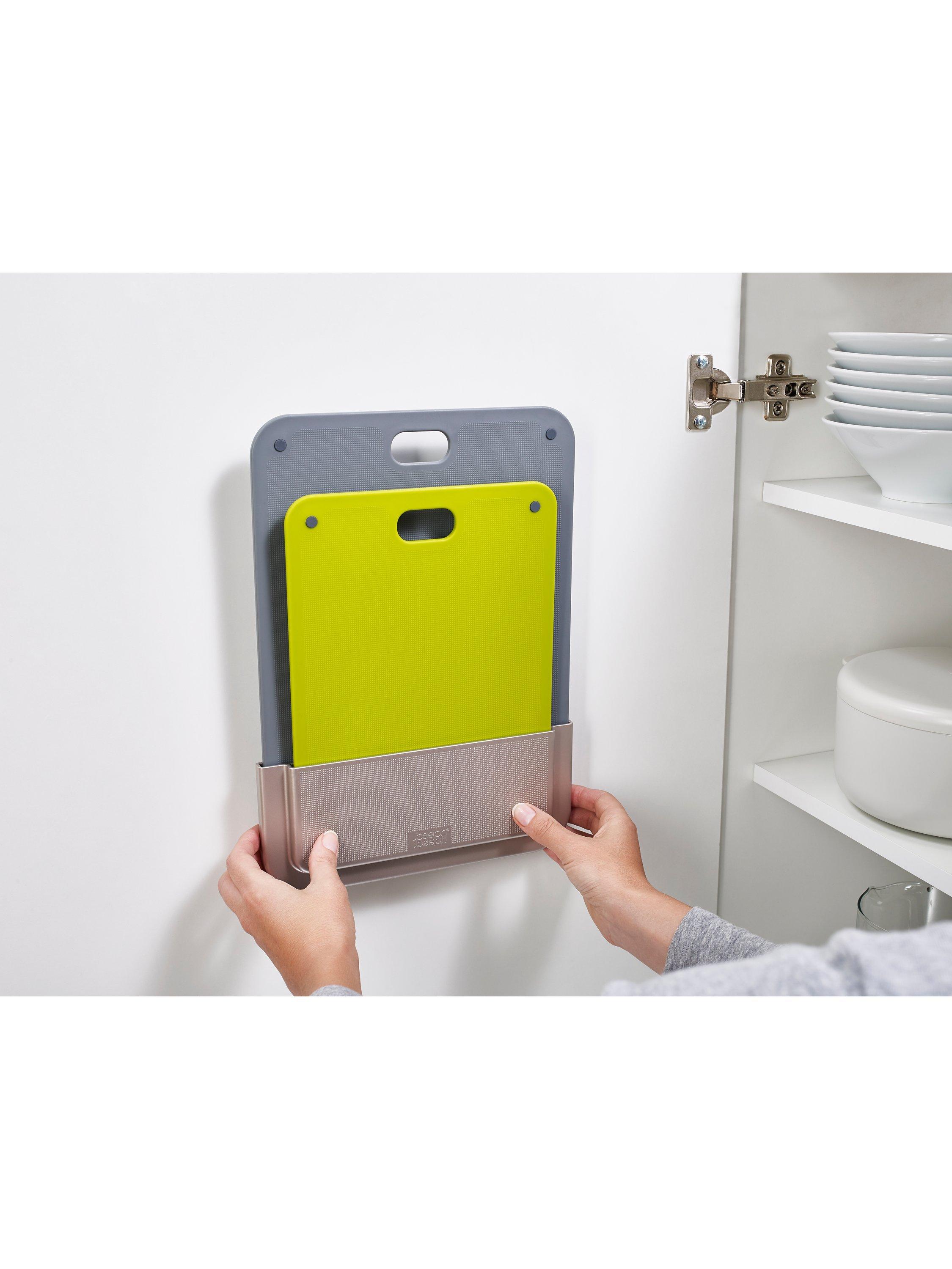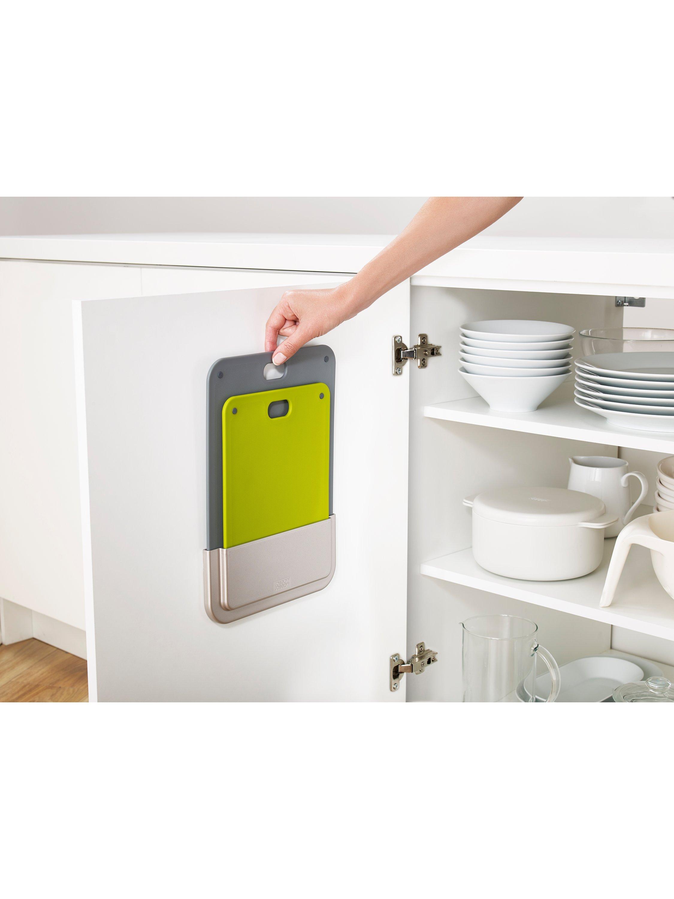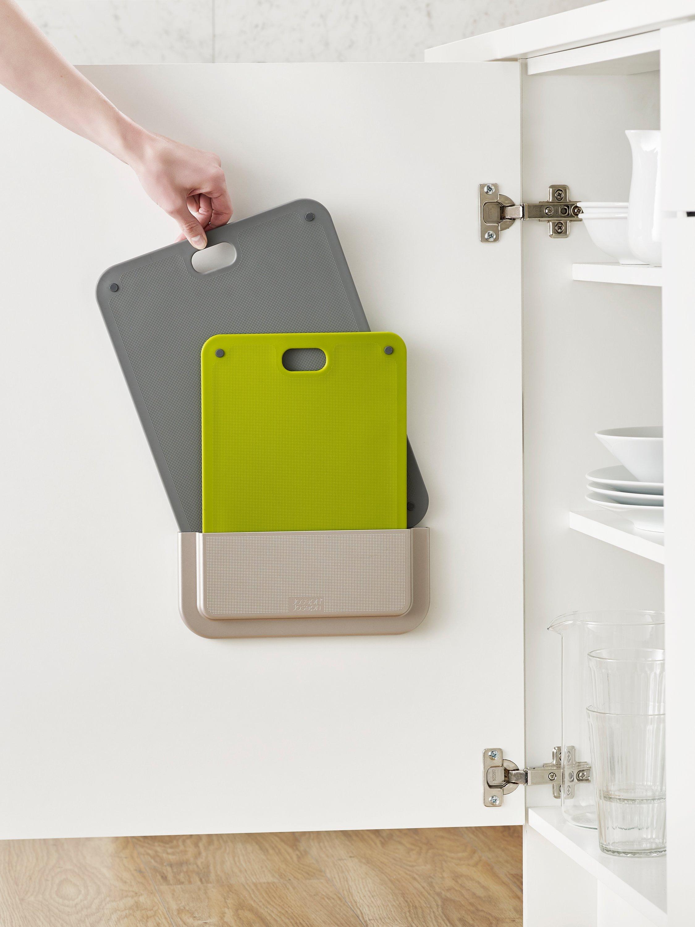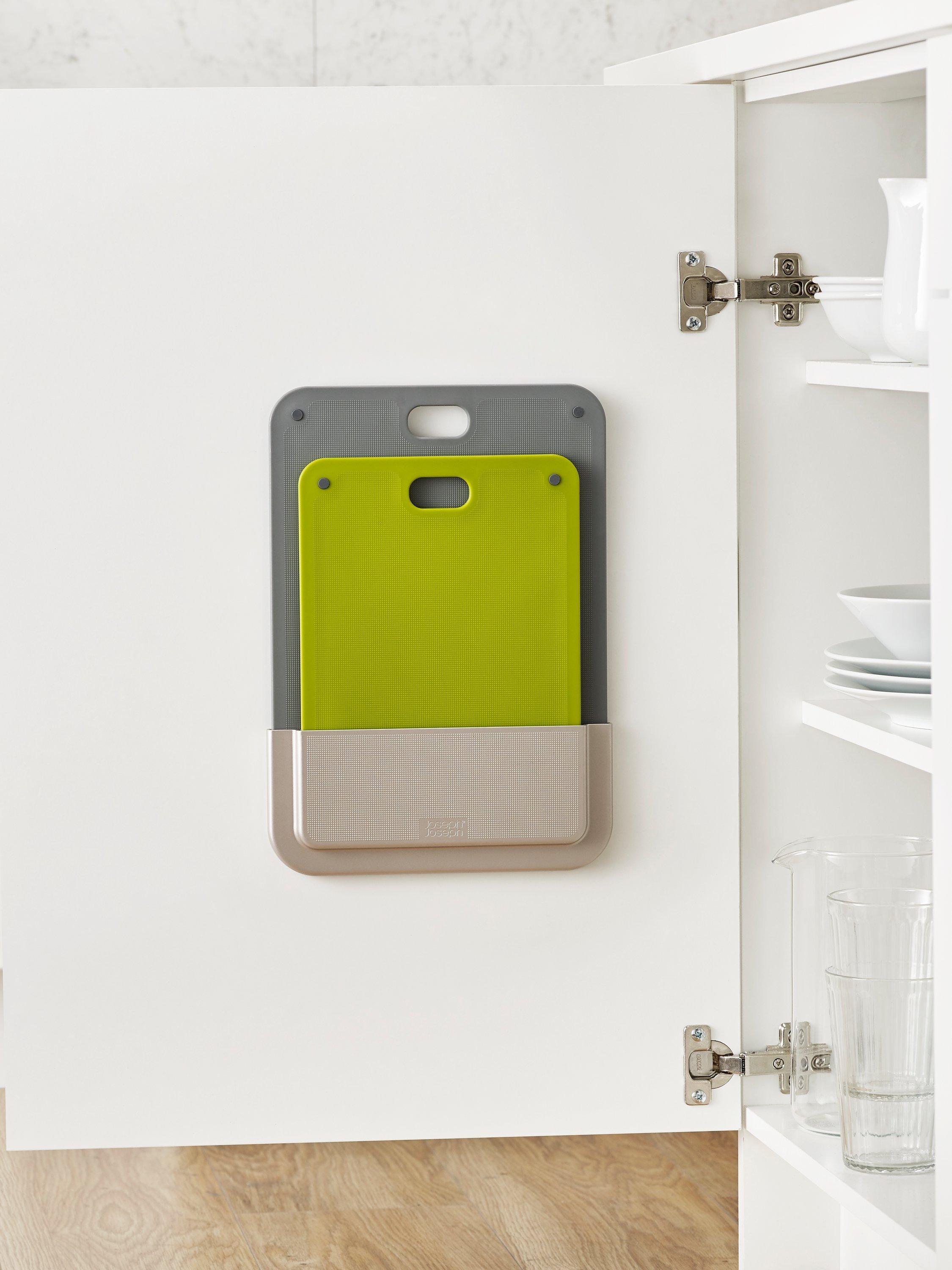 Inventive chopping board set to make best use of the space inside your cupboard by storing on the back of the door.